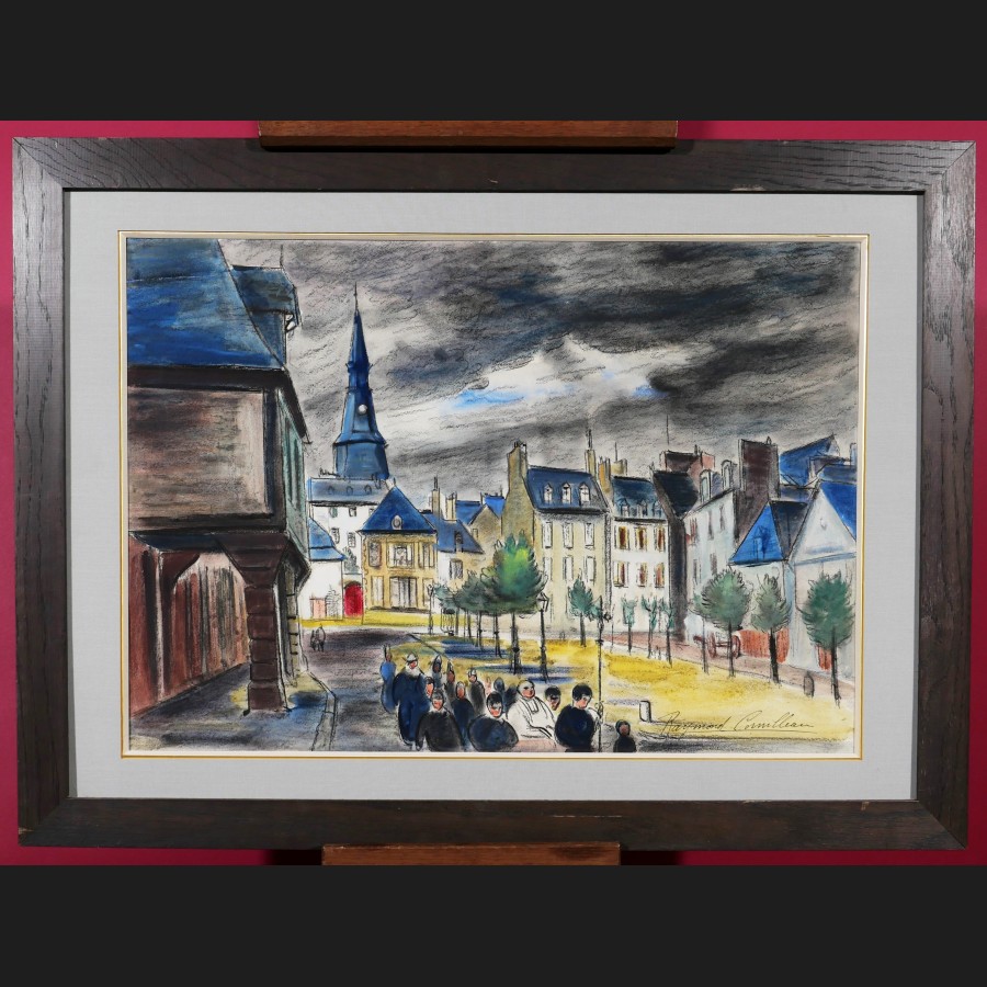 Raymond CORNILLEAU, Place animée en Bretagne, aquarelle