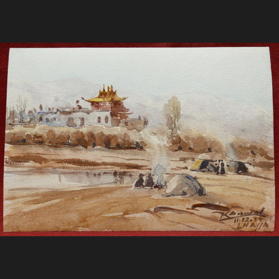 Krishna KANWALL, Vue d'un monastère à Lhassa au Tibet, aquarelle