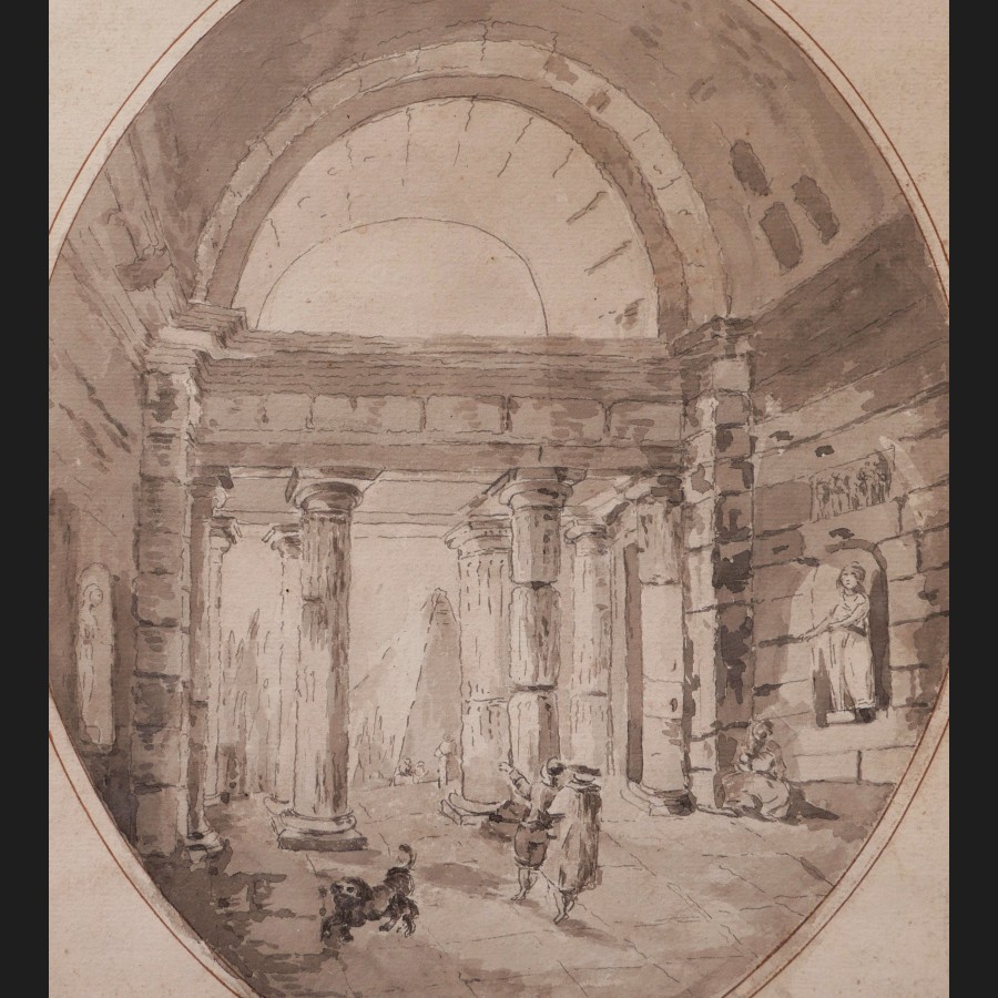 École FRANÇAISE du XVIIIème siècle, entourage d'Hubert ROBERT, Chien et personnages dans un monument antique, dessin