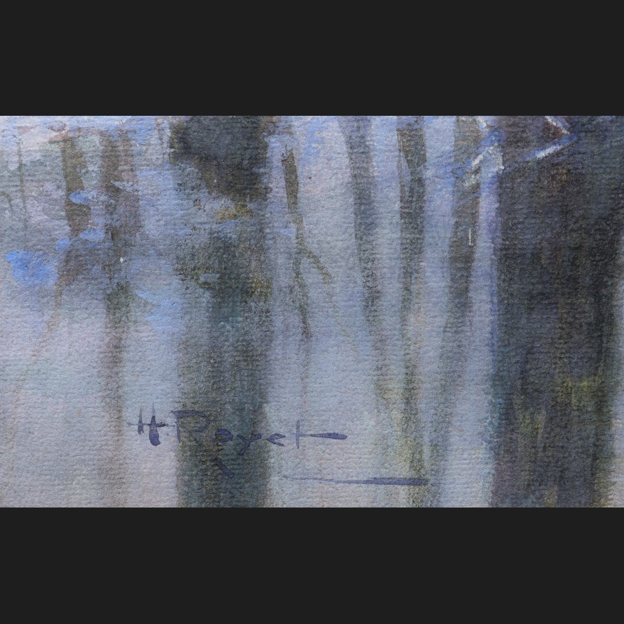 Henri ROYET, Paysage enneigé aux arbres en bord de rivière, aquarelle