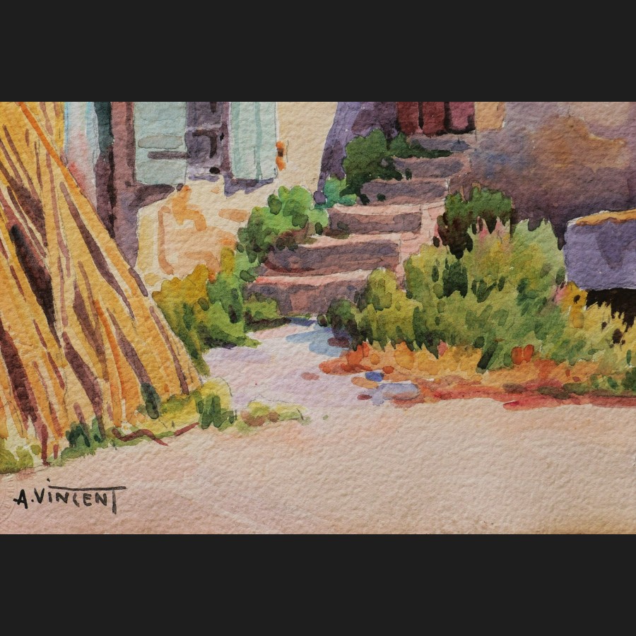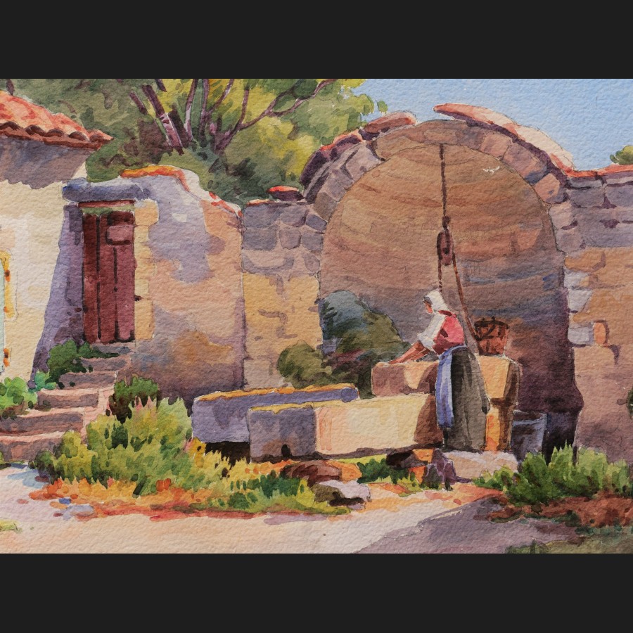 Antoine VINCENT, Paysanne puisant de l'eau dans une cour de ferme à Aramon près d'Avignon, aquarelle