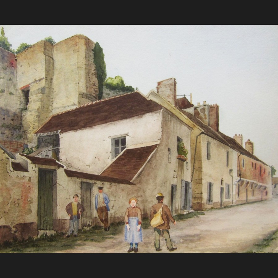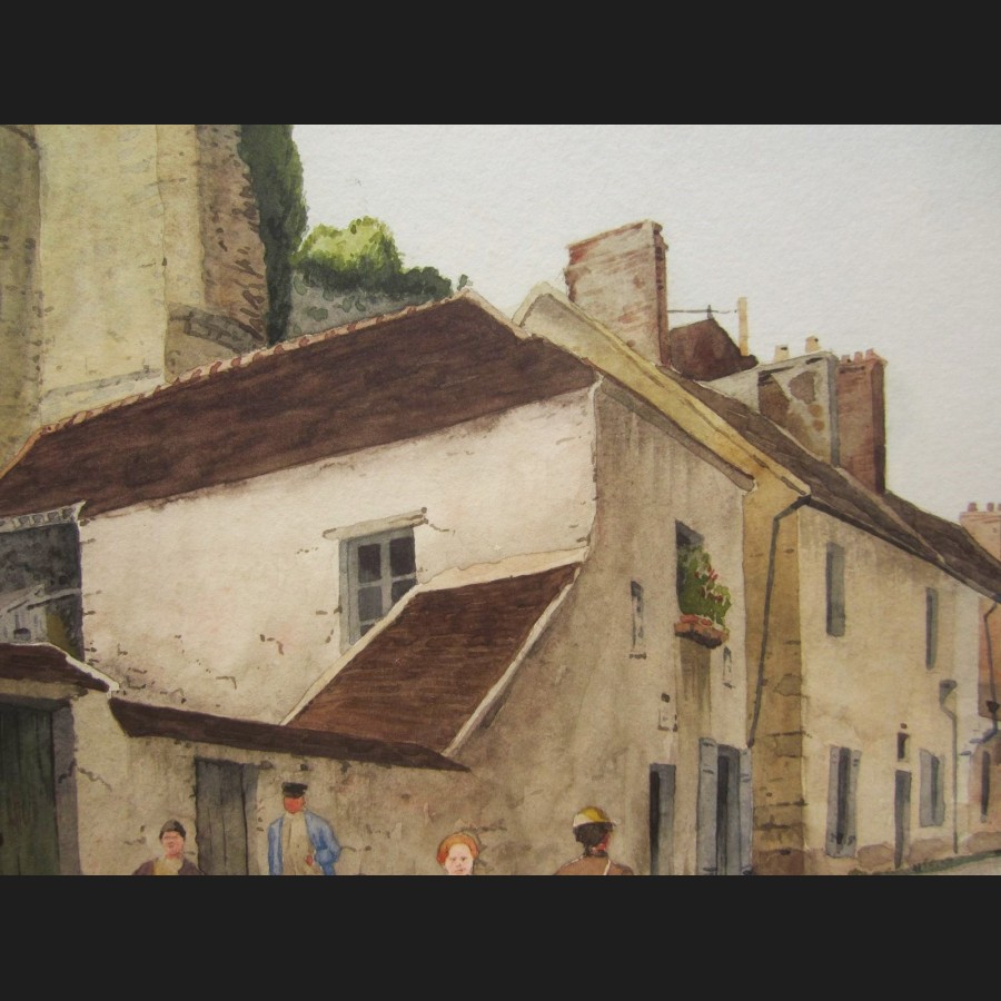 Abel CHANCEL, Rue animée sous les remparts à Provins, aquarelle