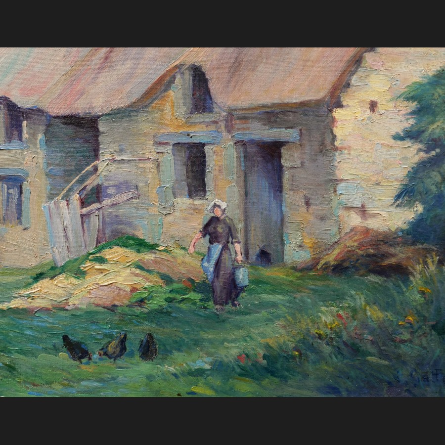 Laurent GALLIO, Ferme, fermière et poules, tableau