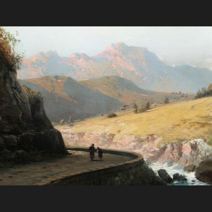 Alfred GODCHAUX, Paysage des Pyrénées avec deux personnages sur un chemin, tableau