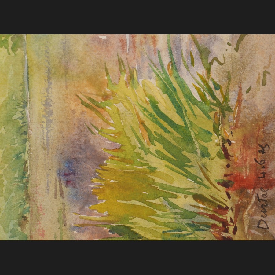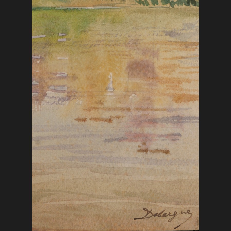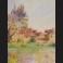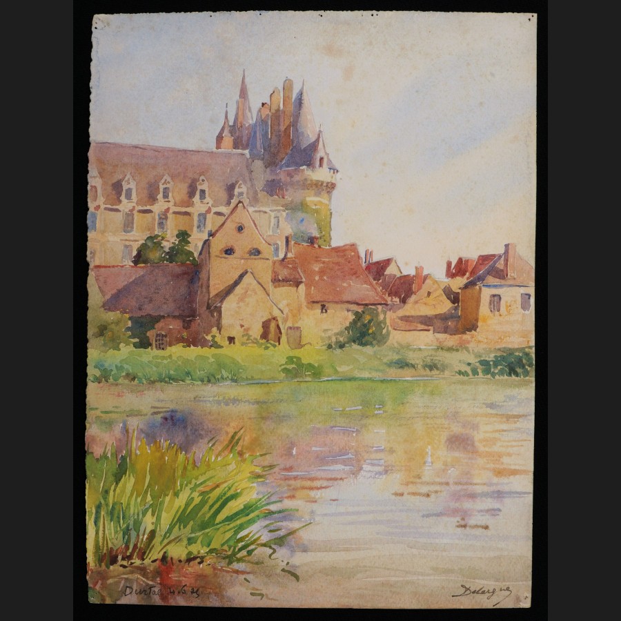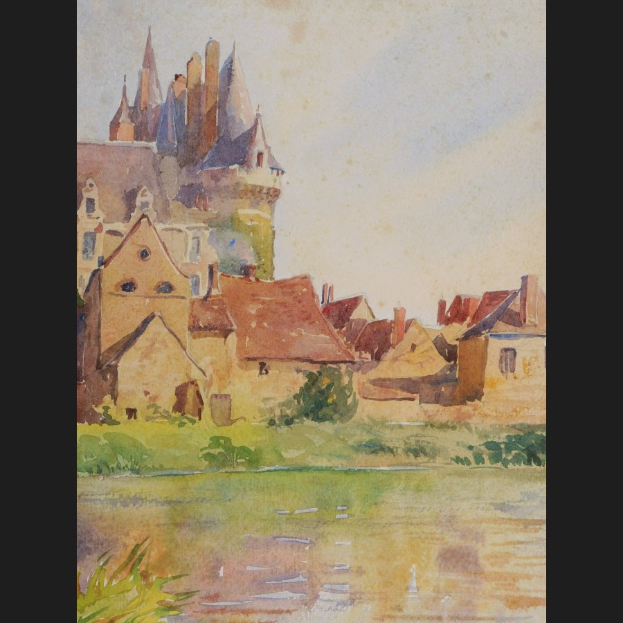 André Alfred DEBERGUE, Vue du clocher de l'église Notre-Dame à Josselin, aquarelle