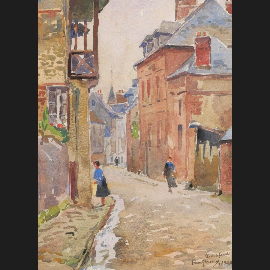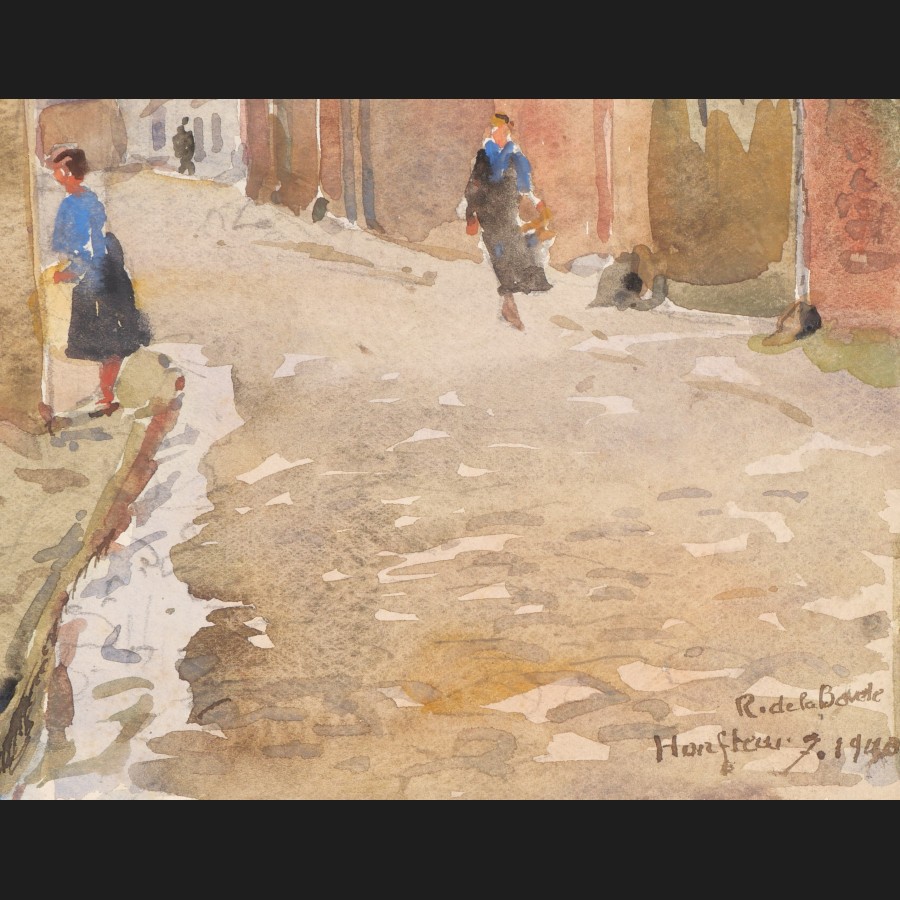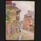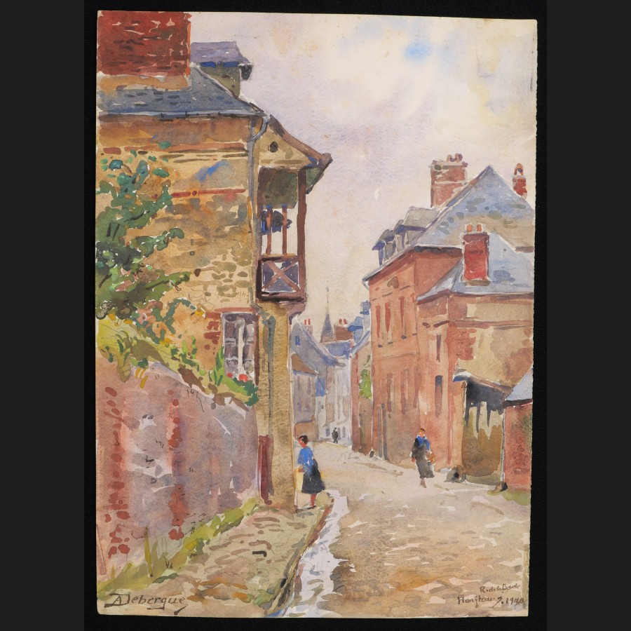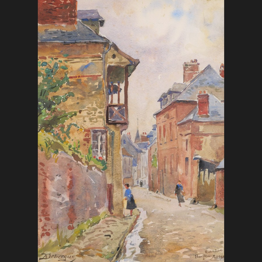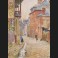 André Alfred DEBERGUE, Vue du clocher de l'église Notre-Dame à Josselin, aquarelle