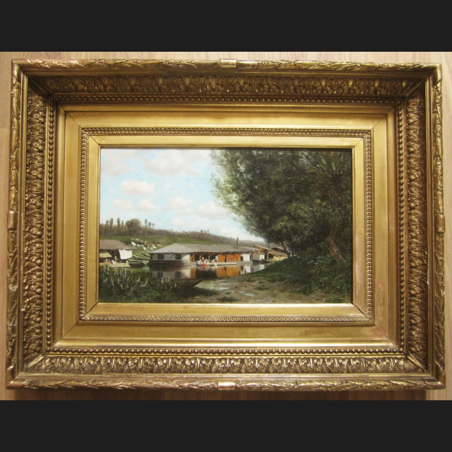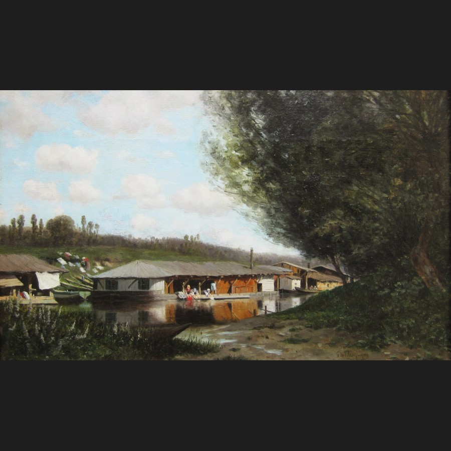 Claude François Auguste de MESGRIGNY, Paysage aux lavandières et bateau-lavoir, tableau
