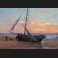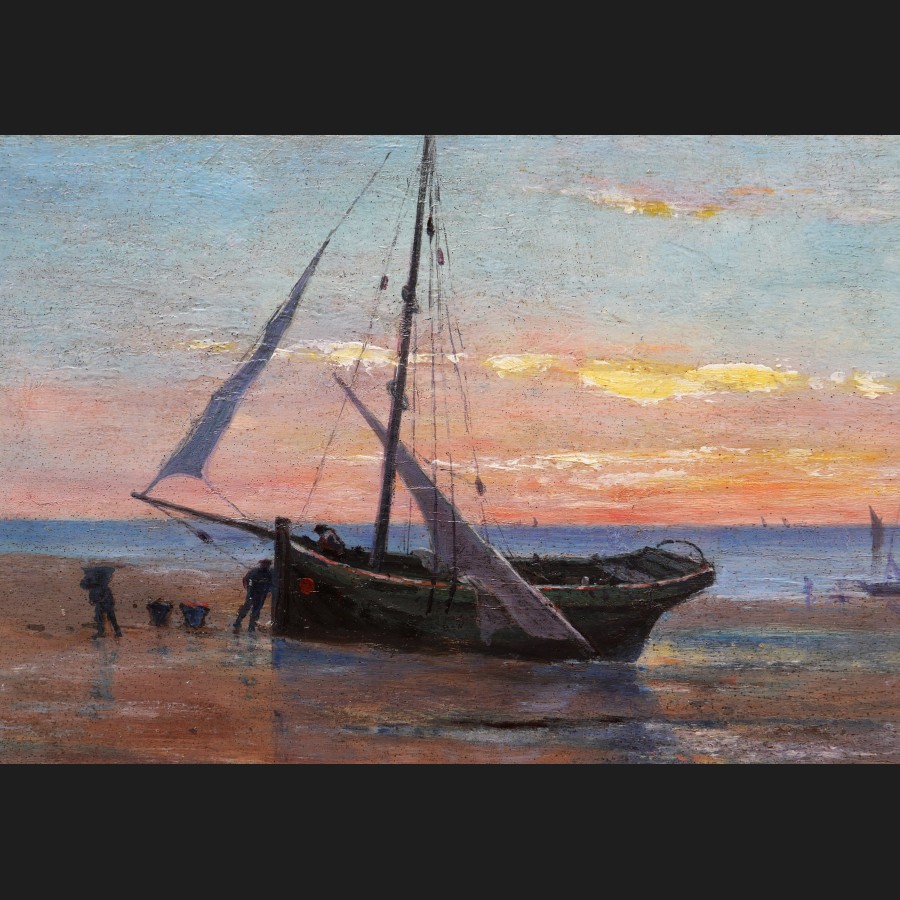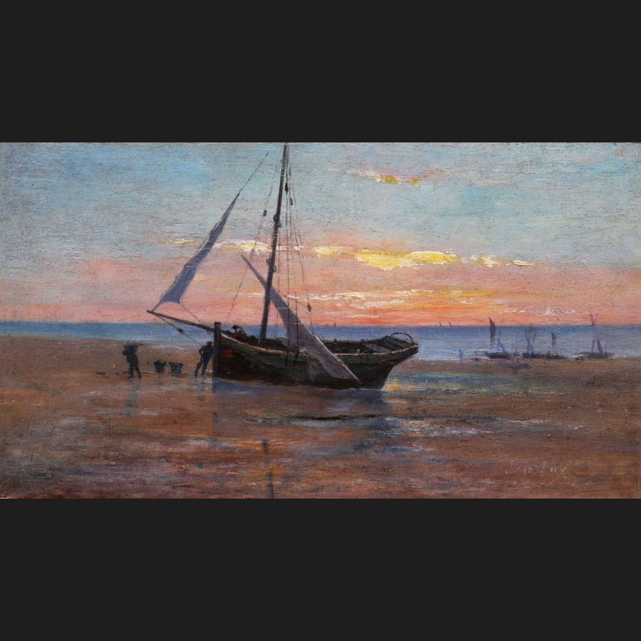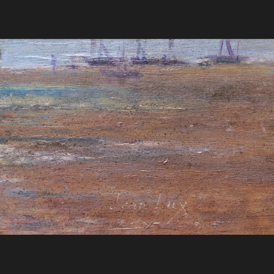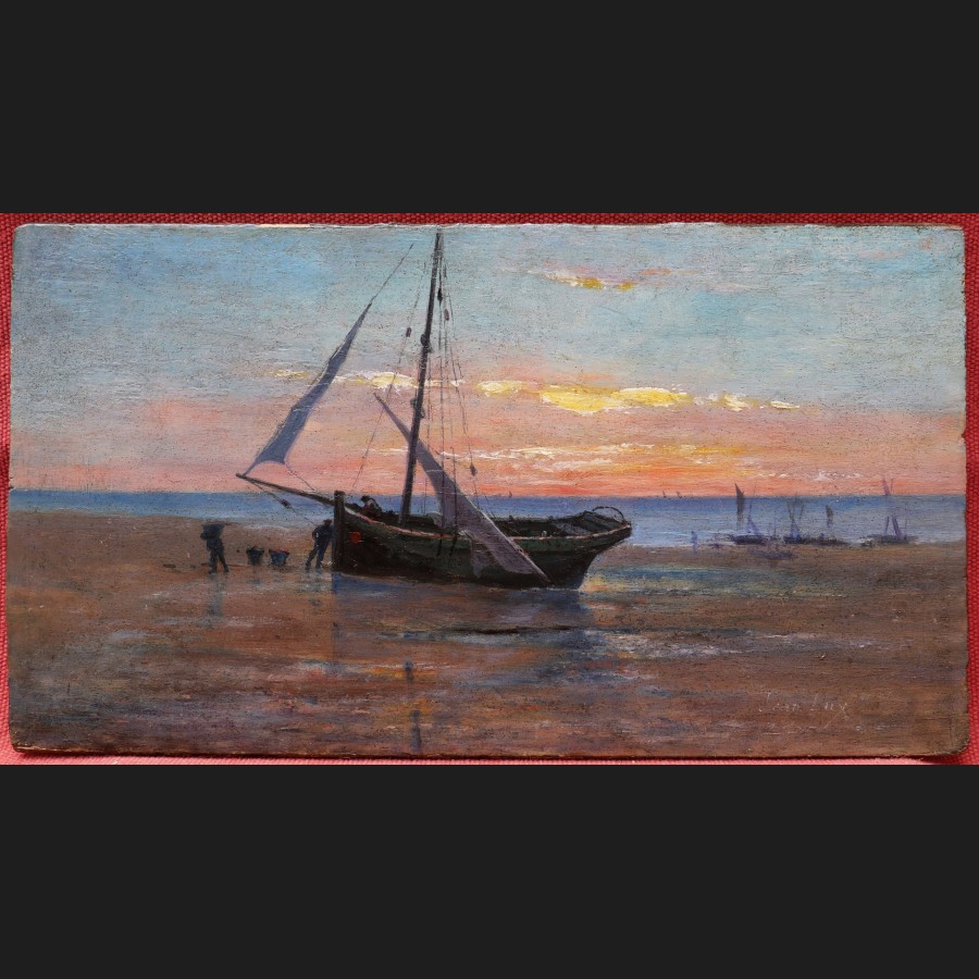 Jean LUX, Bateaux et marins sur la grève, tableau