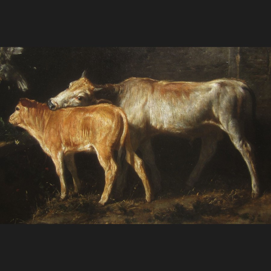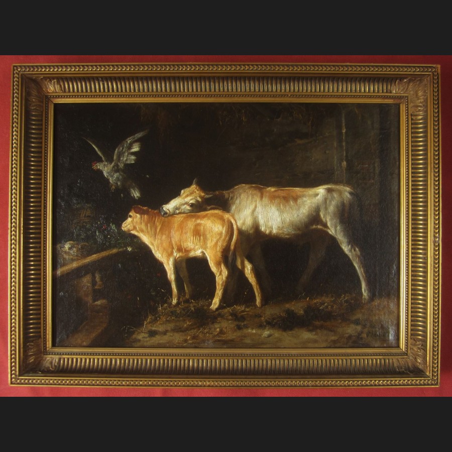 Valerico LACCETTI, Veau, vache et coq dans une étable, tableau