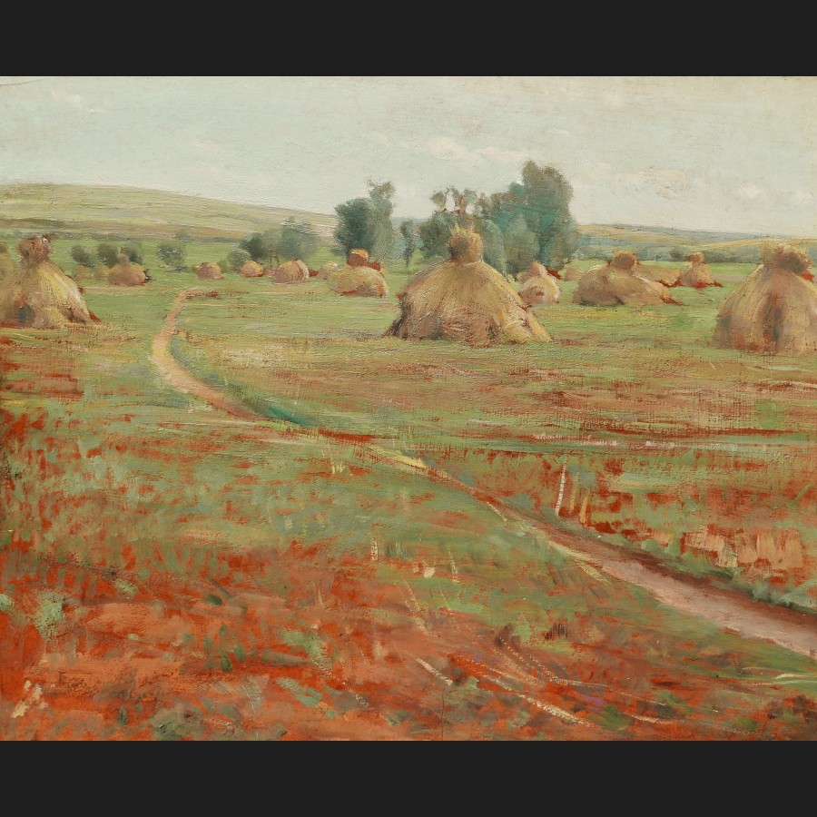 Émile BASTIEN-LEPAGE, Chemin et meules de foin dans la campagne, tableau