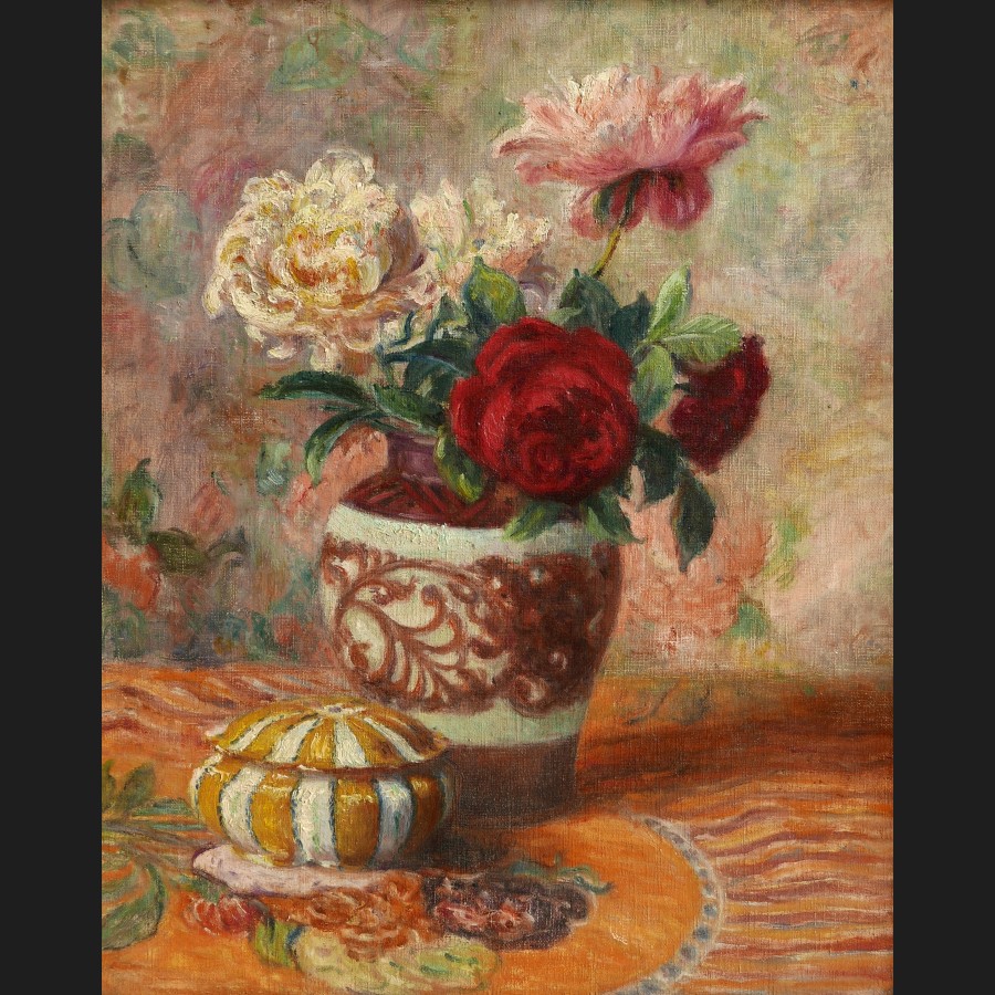 École FRANÇAISE circa 1910, Vase de roses et bonbonnière en porcelaine, tableau