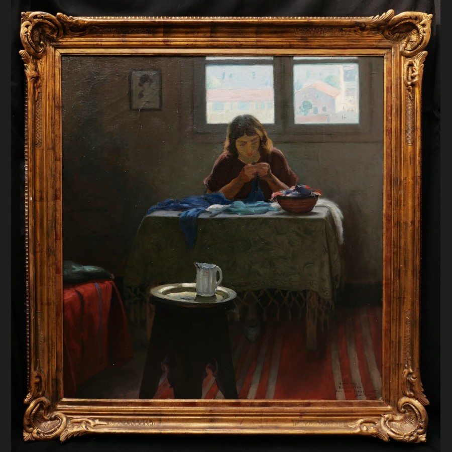 Gustave LINO, La femme de l'artiste cousant dans son appartement à Alger, tableau