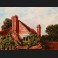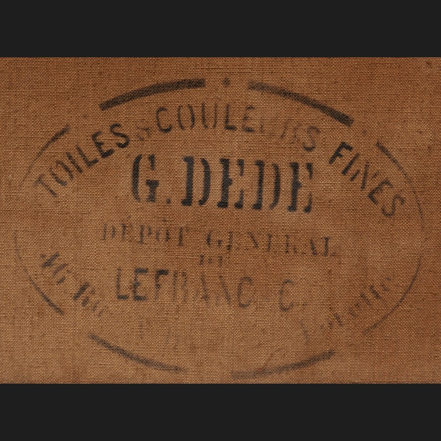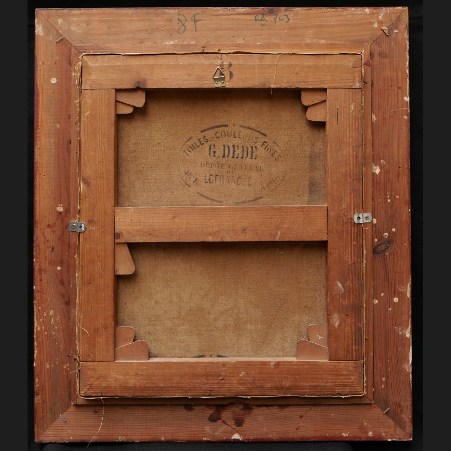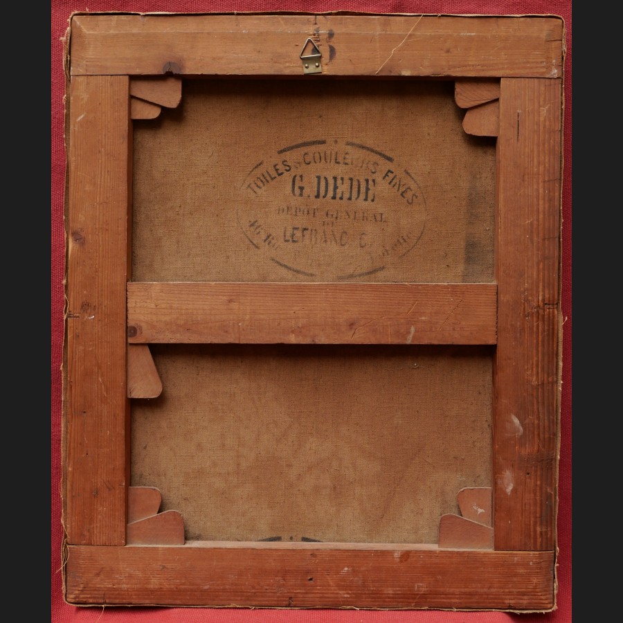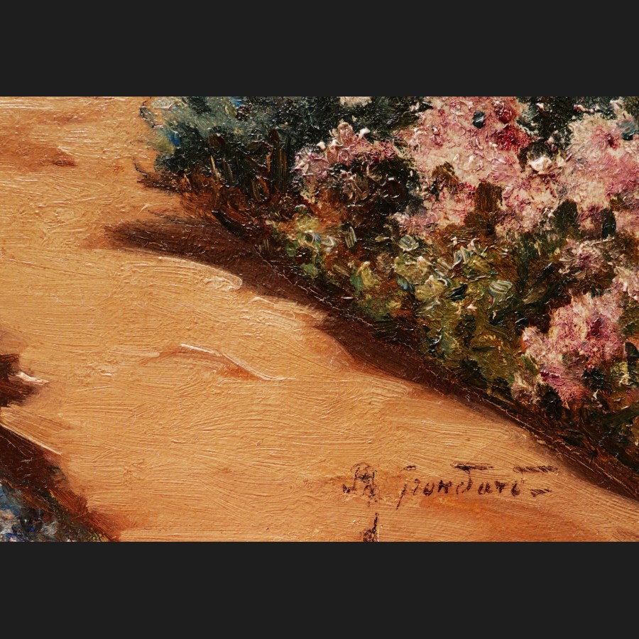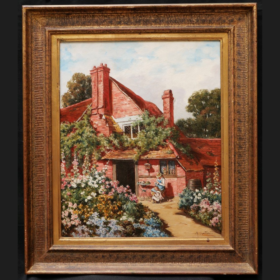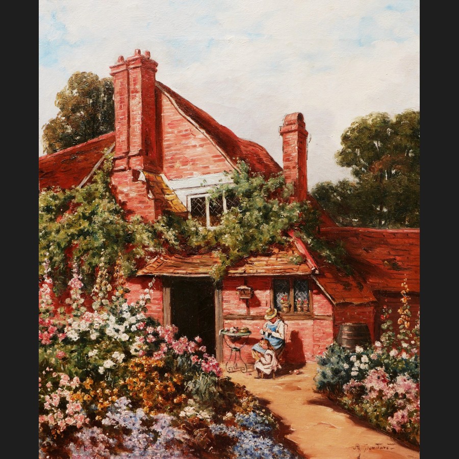 Philippe GRONDART, Femme et fillette cousant au jardin devant leur maison, tableau