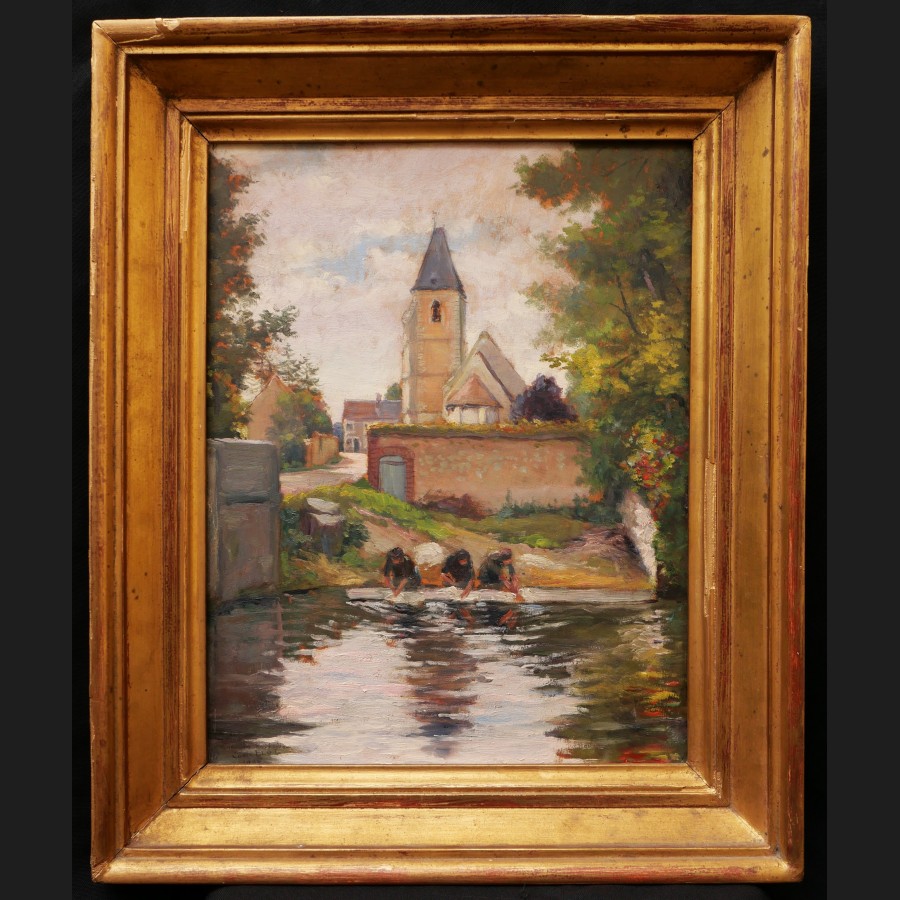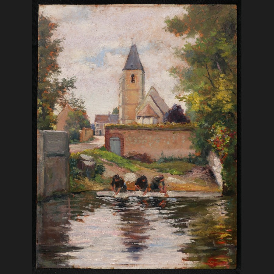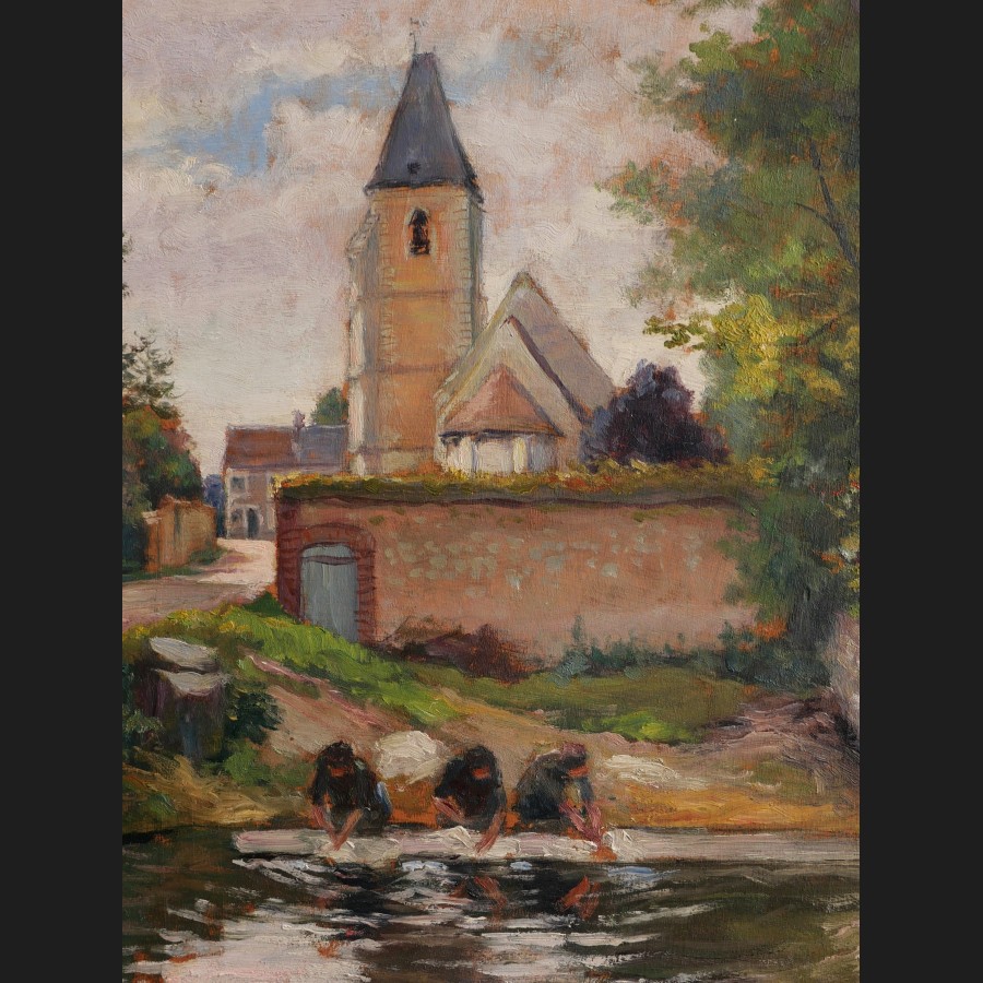 Louis FLOT, Lavandières sur l'Huisne devant l'église Saint-Denis à Condeau (Perche ornais), tableau