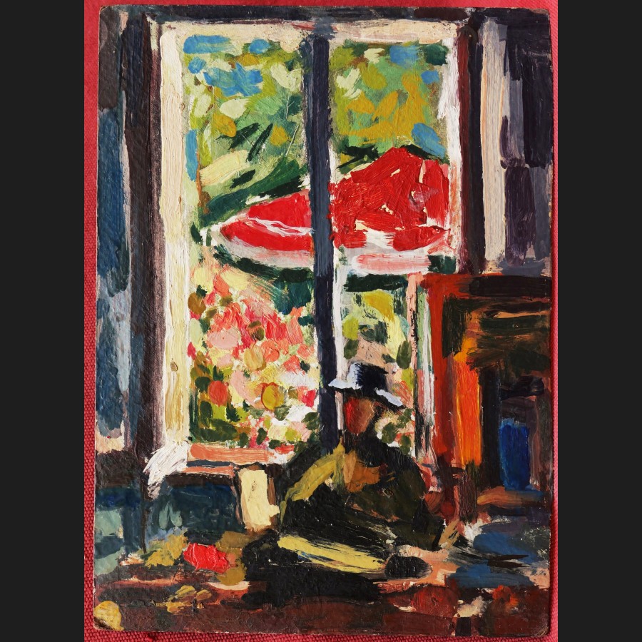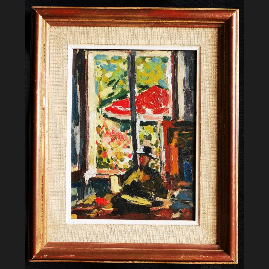 Attribué à Louis VALTAT, Femme assise devant une fenêtre ouvrant sur un jardin ensoleillé, tableau
