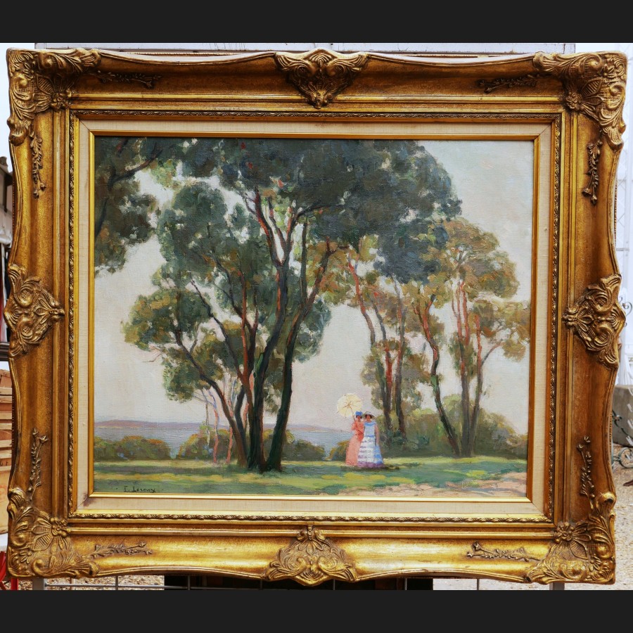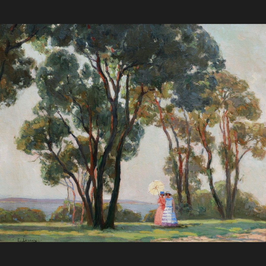 Lucienne LEROUX, Deux femmes portant une ombrelle en bord de mer, tableau
