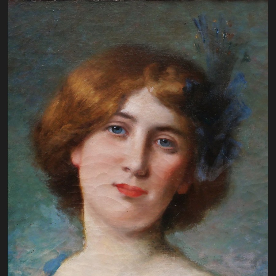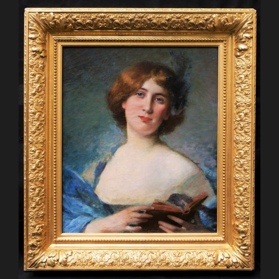 Jules-Frédéric BALLAVOINE, Portrait de jeune femme rousse aux yeux bleus tenant un livre, tableau