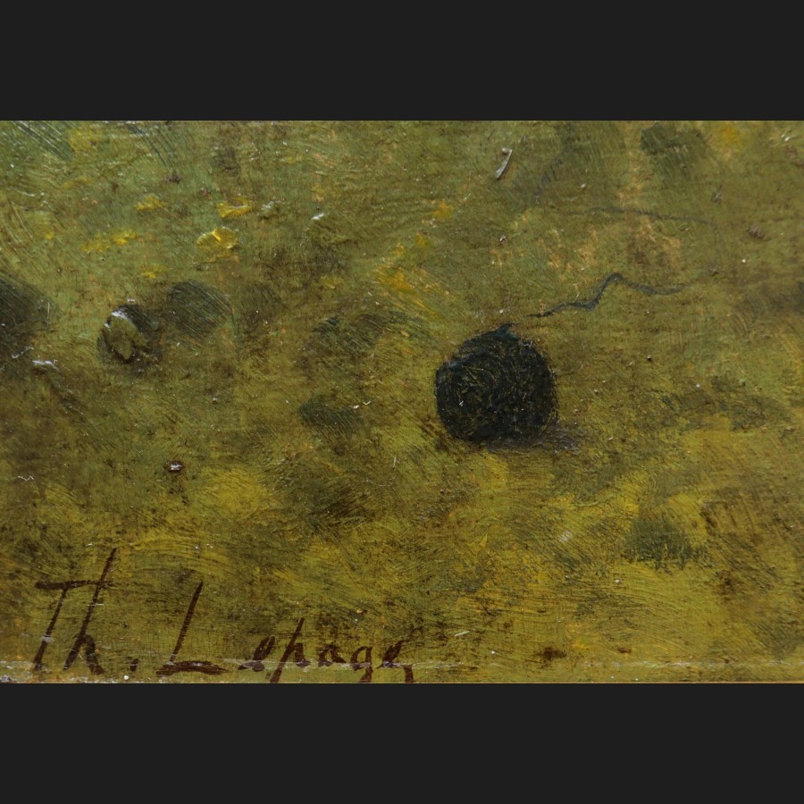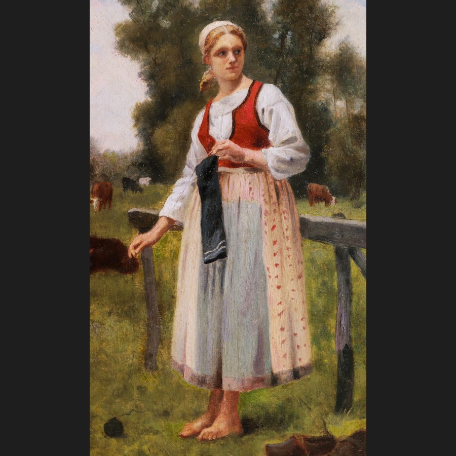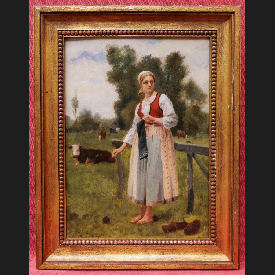 Th. LEPAGE, Paysanne tricotant dans un champ de vaches, tableau