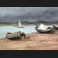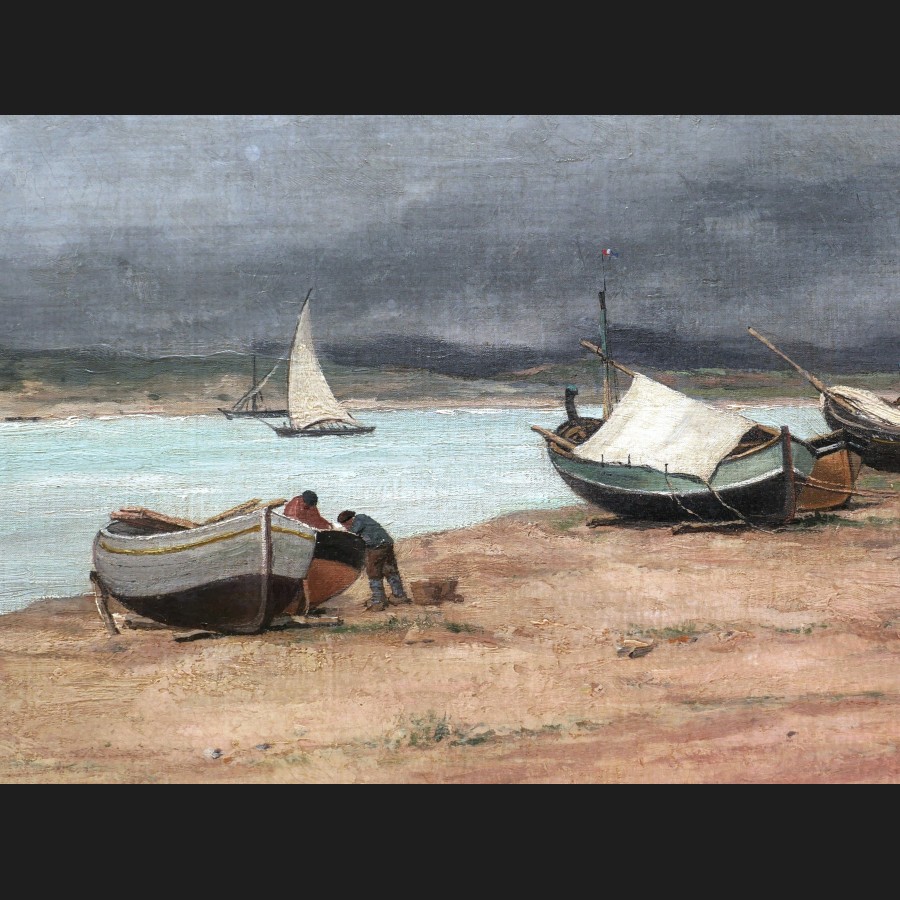 Paysage animé en Catalogne au bord d'une embouchure de rivière, des marins s'affairant autour des barques