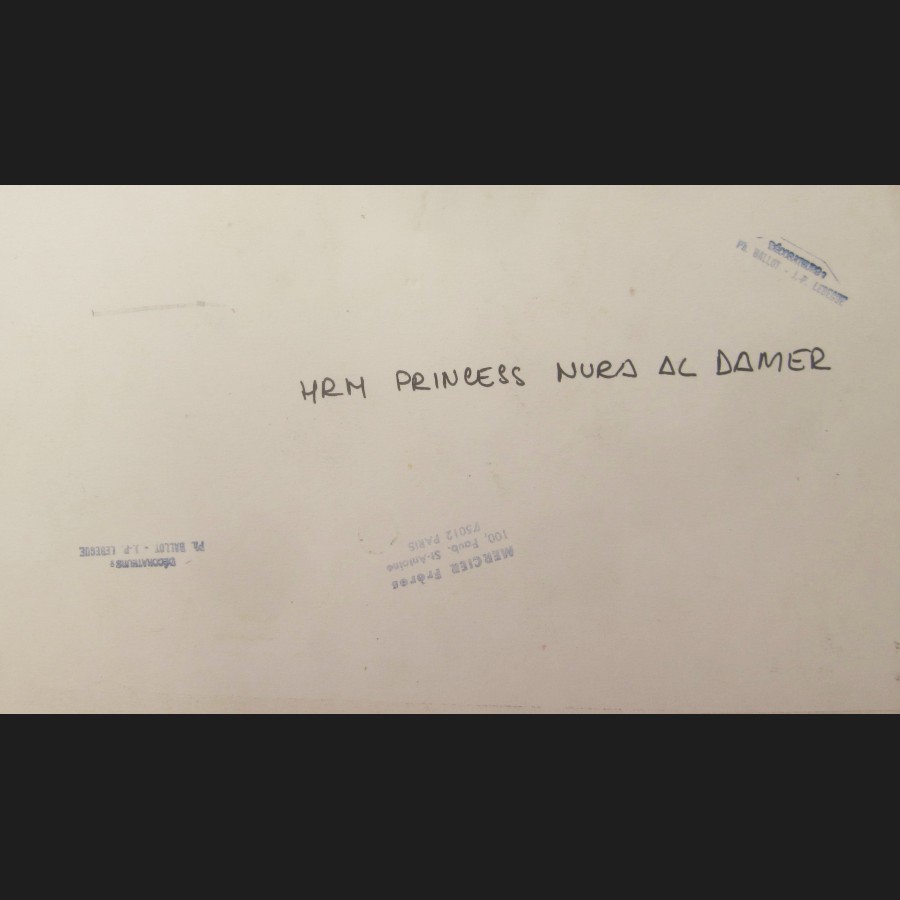 Inscrit au dos HRM PRINCESS NURA AL DAMER, cachets de la maison MERCIER Frères, 100 Faub. Saint-Antoine 75012 PARIS et des décorateurs BELLOT et LEBEGUE