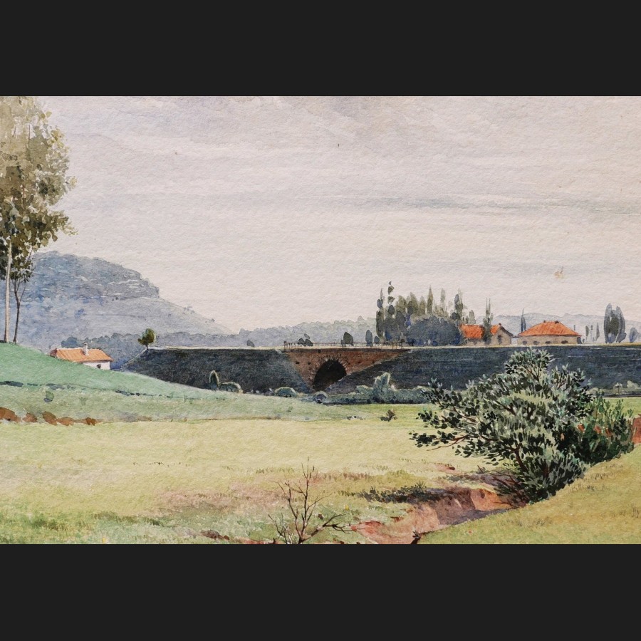 École FRANÇAISE circa 1910, Paysage au pont au Pays Basque, aquarelle