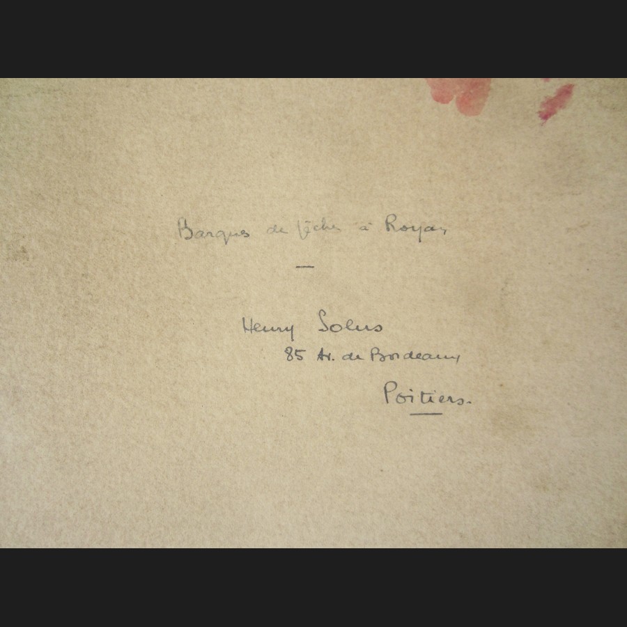 Signé et daté en bas à droite H. Solus 29, contresigné, situé et titré au revers Barques de pêche à Royan / Henry Solus / 85 av. de Bordeaux / Poitiers