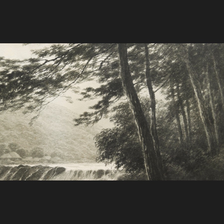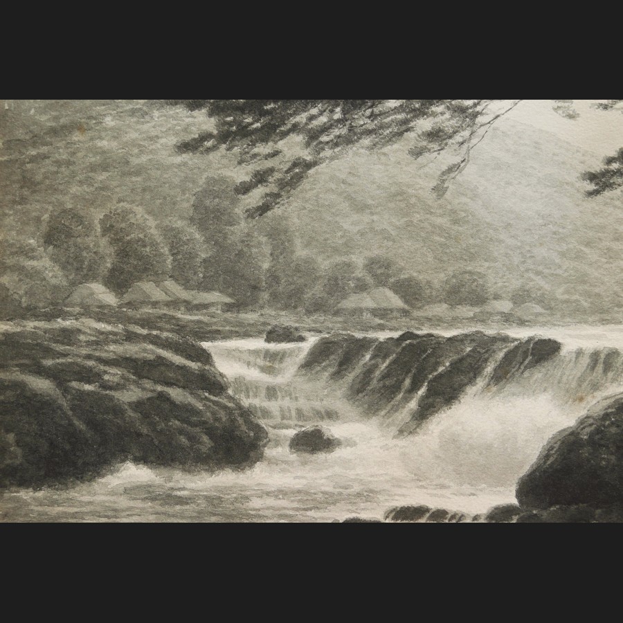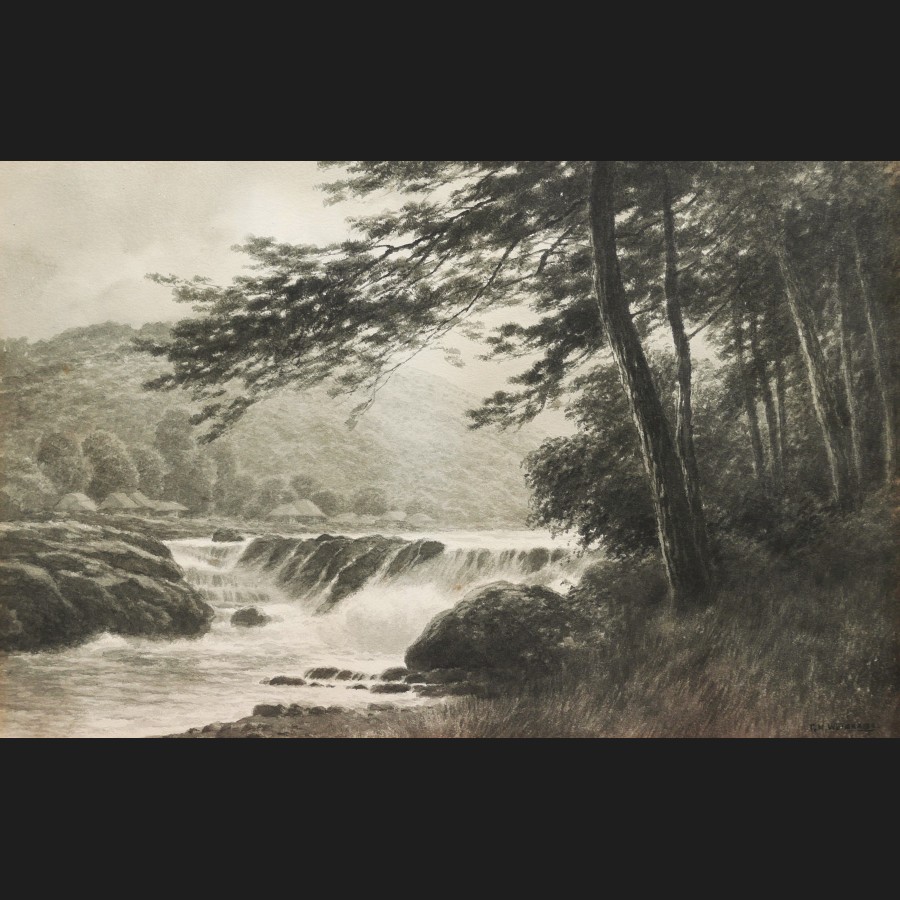 T.H. WATANABE, Paysage du Japon : village, cascade et forêt, lavis