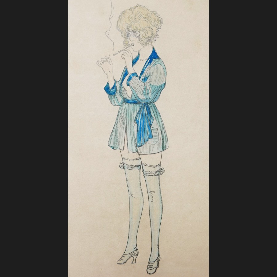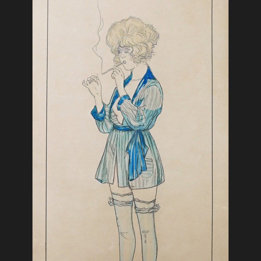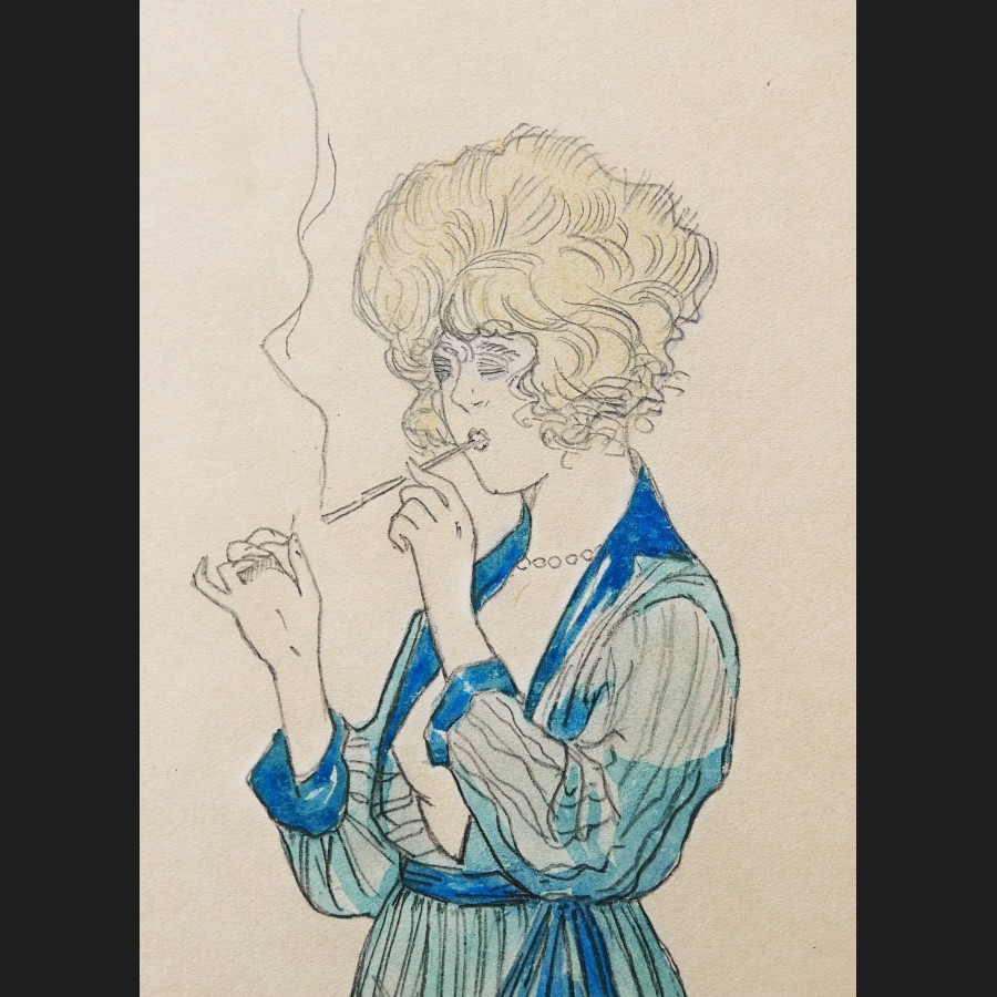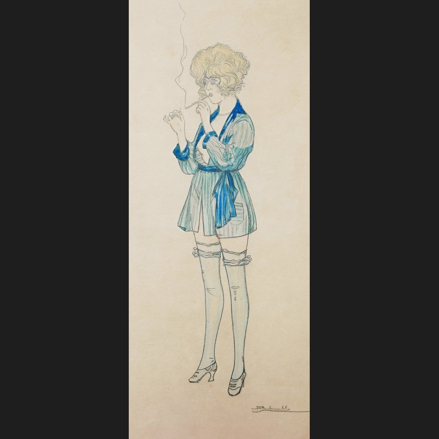 Marcel BUCHAILLE, Jeune femme en déshabillé fumant une cigarette, dessin