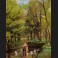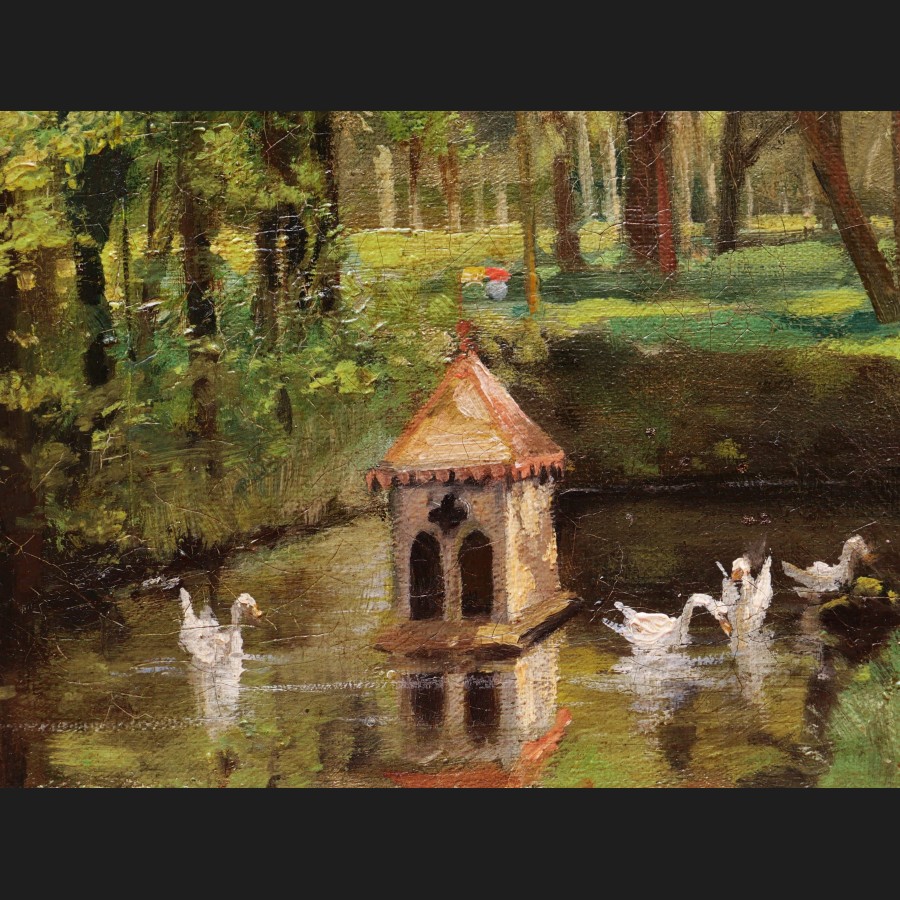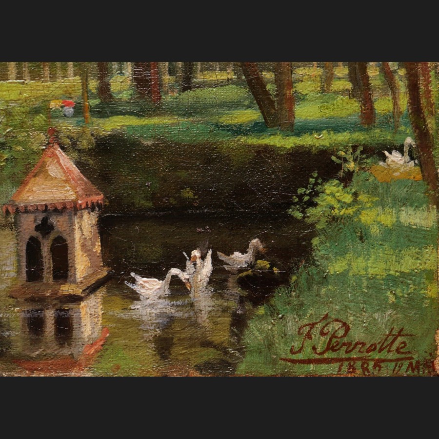 F. PERROTTE, Cygnes sur une pièce d'eau dans un parc, tableau