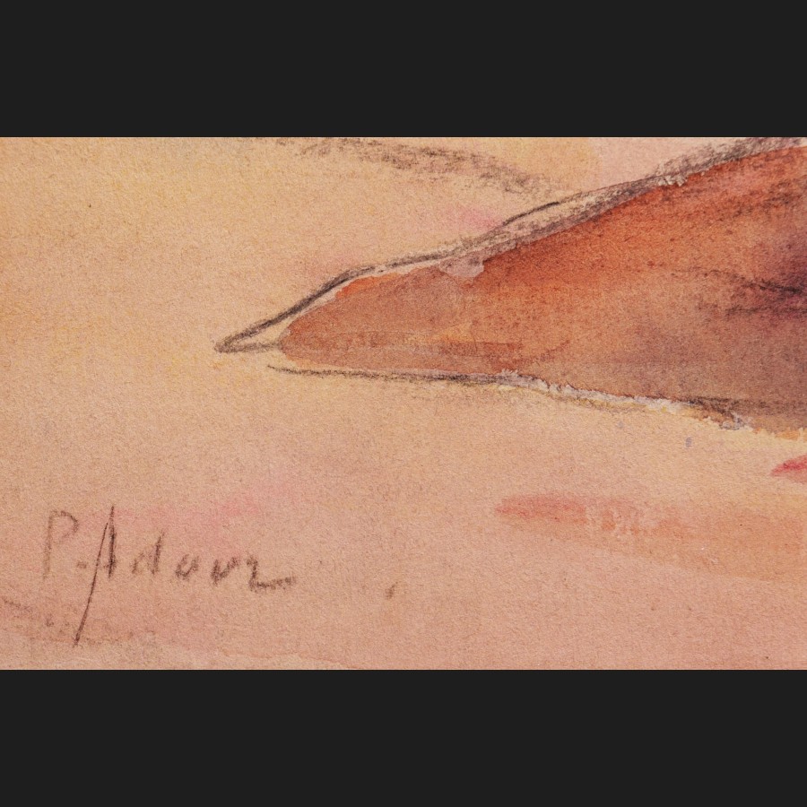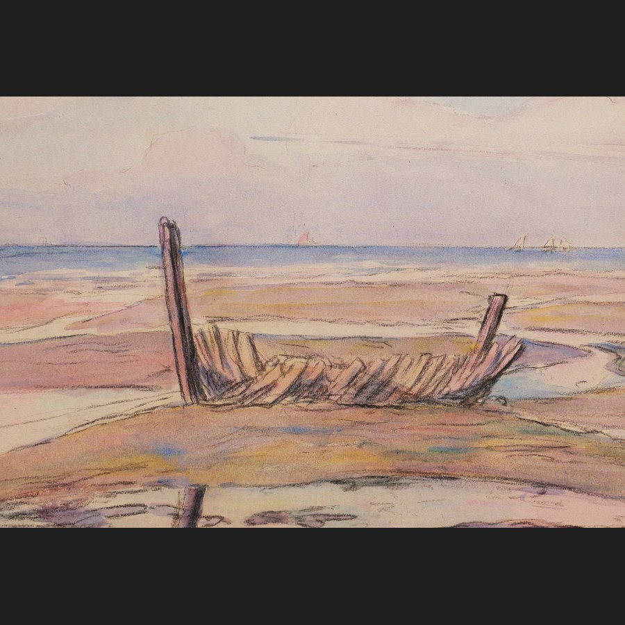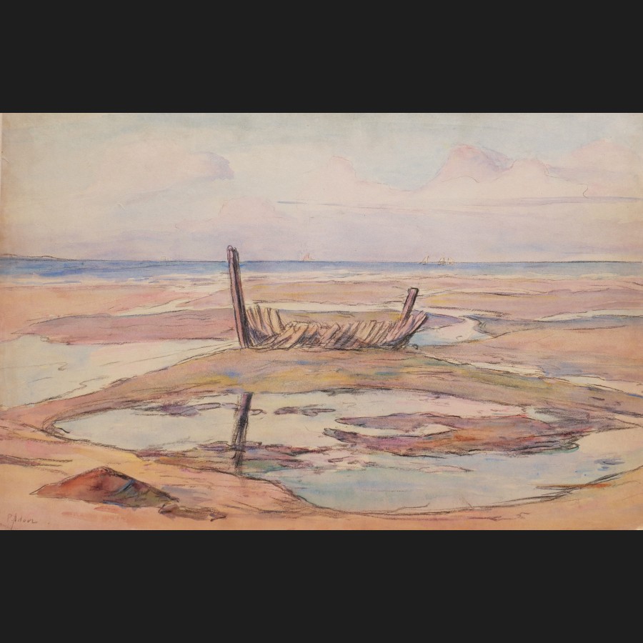 Pauline Françoise ADOUR (active entre 1905 et 1937)Épave sur la grèveFusain et aquarelle sur papierSigné en bas à gauche P. Adour41,5 x 63,5 cm