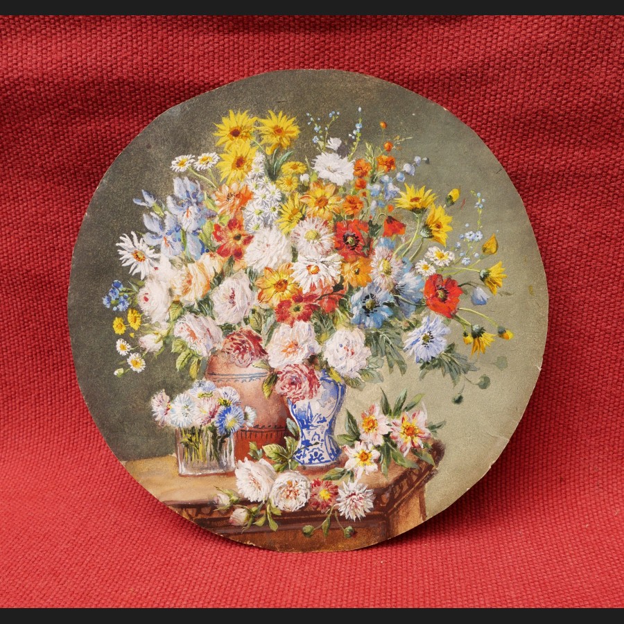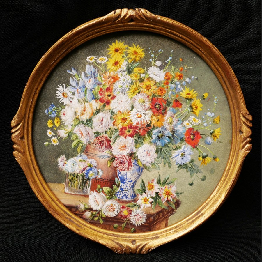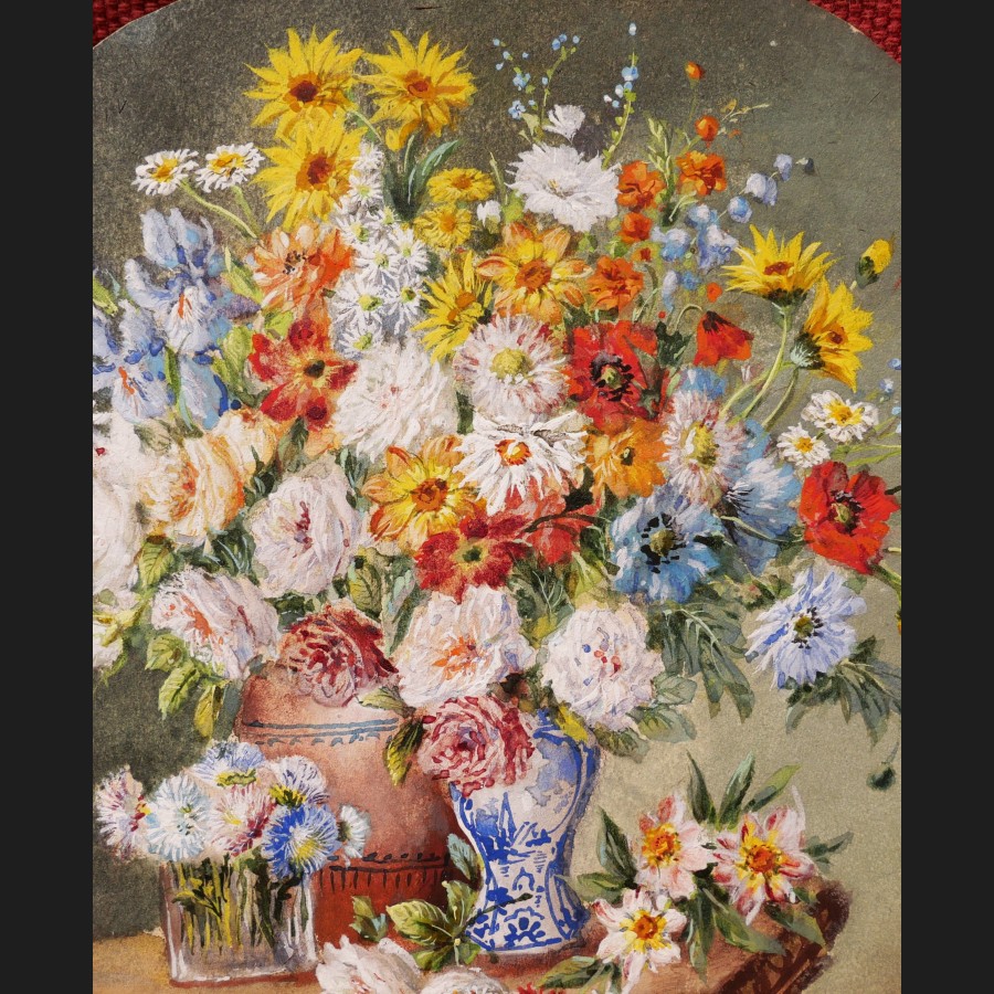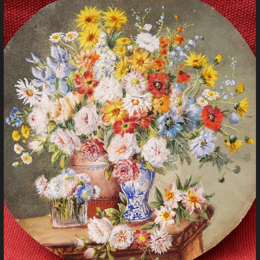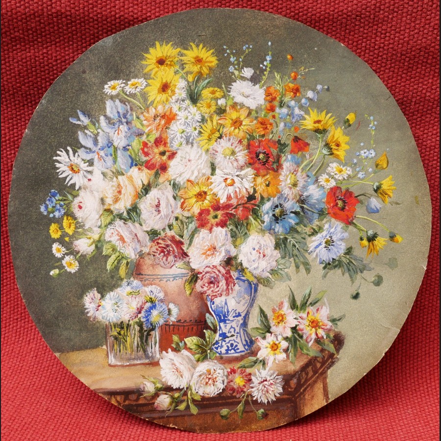 École française circa 1900, Nature morte aux vases et verre de fleurs sur un entablement, miniature