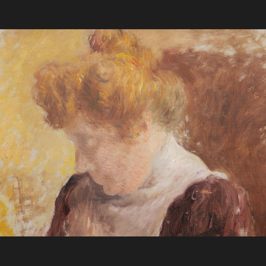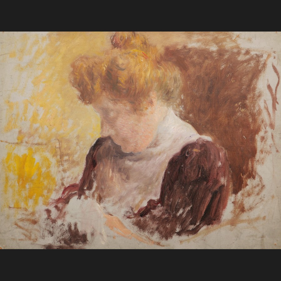 École FRANÇAISE impressionniste, fin XIXème siècleFemme cousantHuile sur carton27 x 35 cm