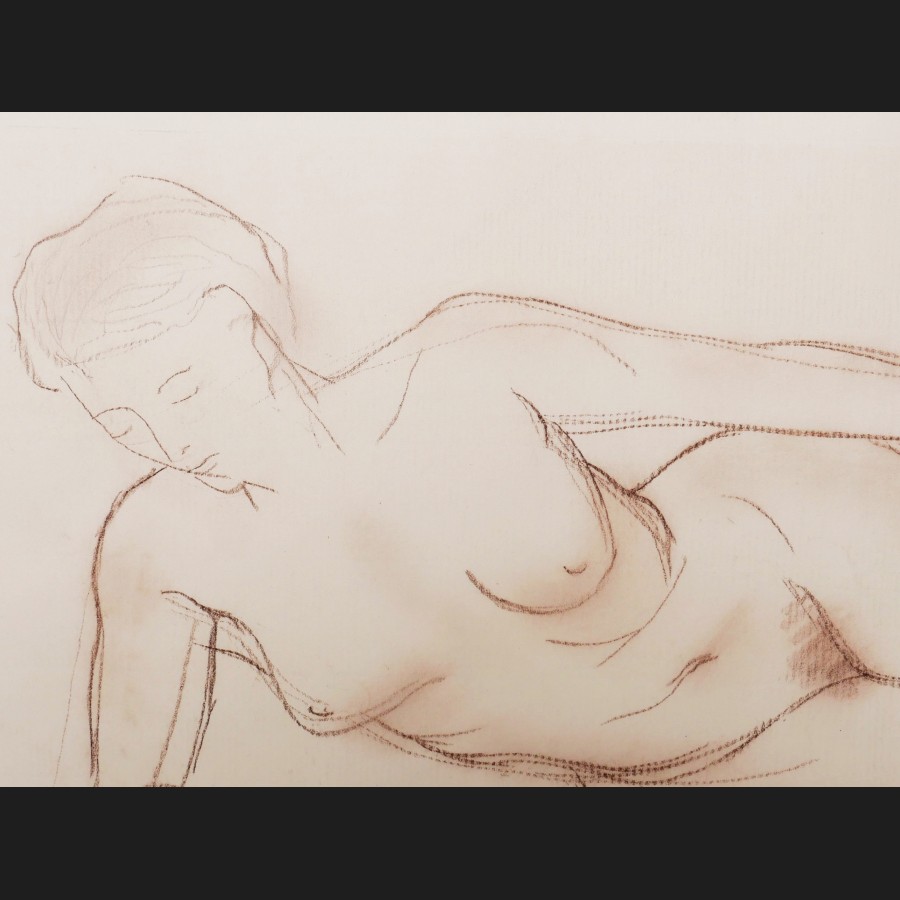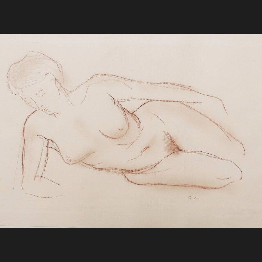Gérard CHOAIN (Lille, 1906 – Paris, 1988)Nu féminin allongéCrayon brun sur papierMonogrammé en bas à droite G.C.23 x 32,5 cm