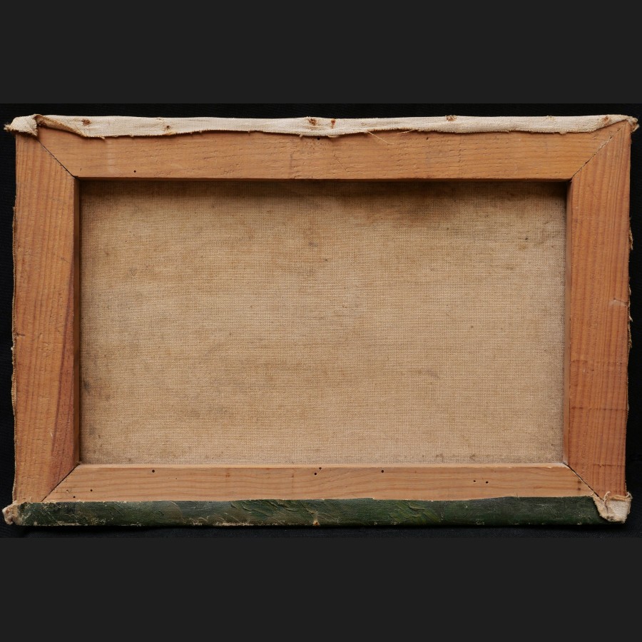 Monogrammé en bas à droite sur une partie de la toile repliée derrière le châssis M.C.