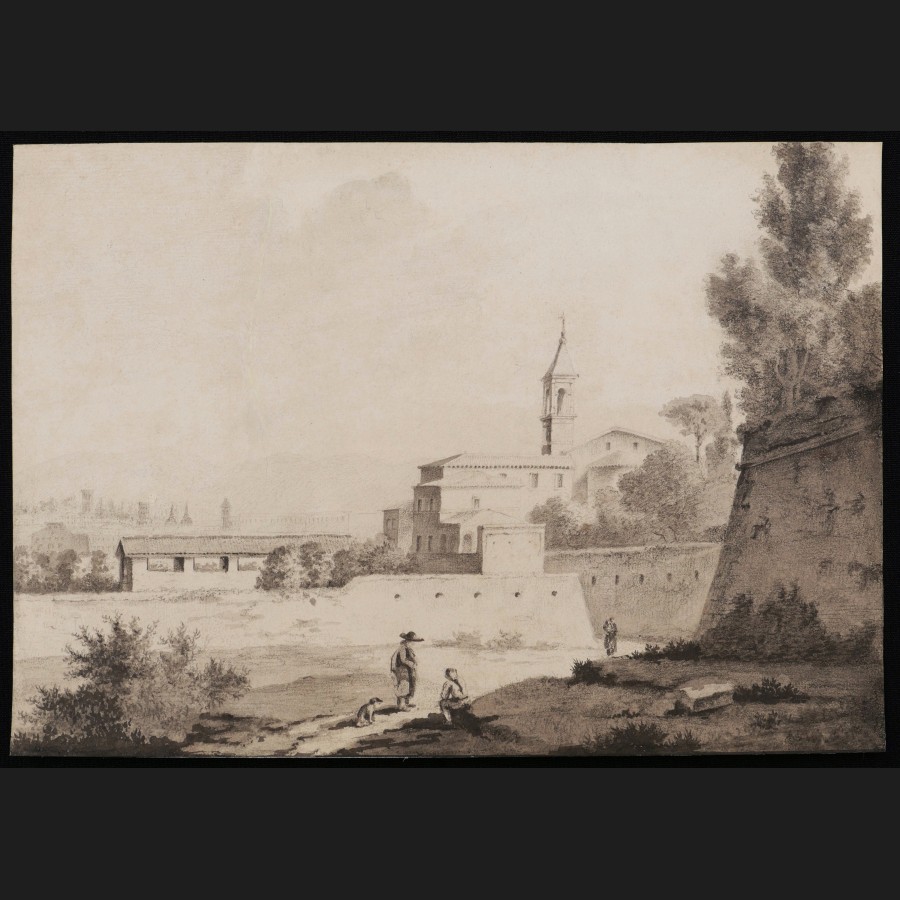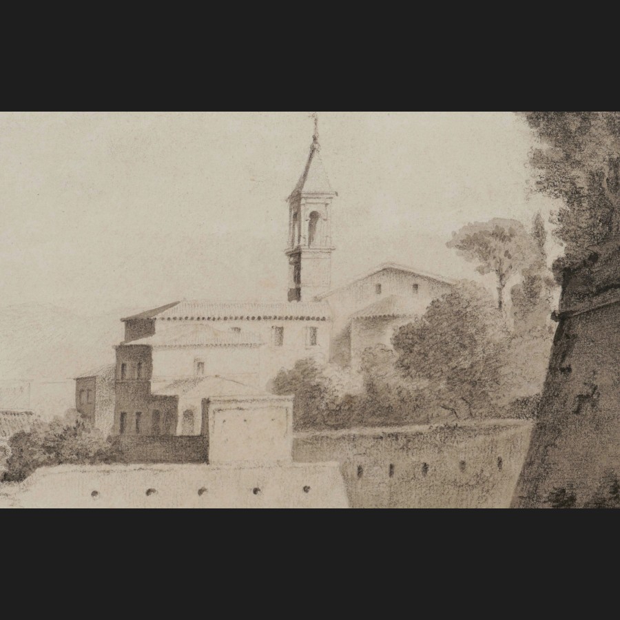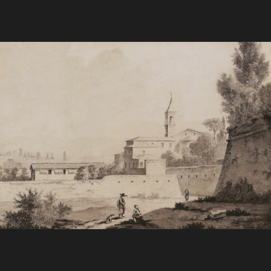 École FRANÇAISE début XIXème siècle, Vue animée à Rome : personnages, église et remparts, dessin