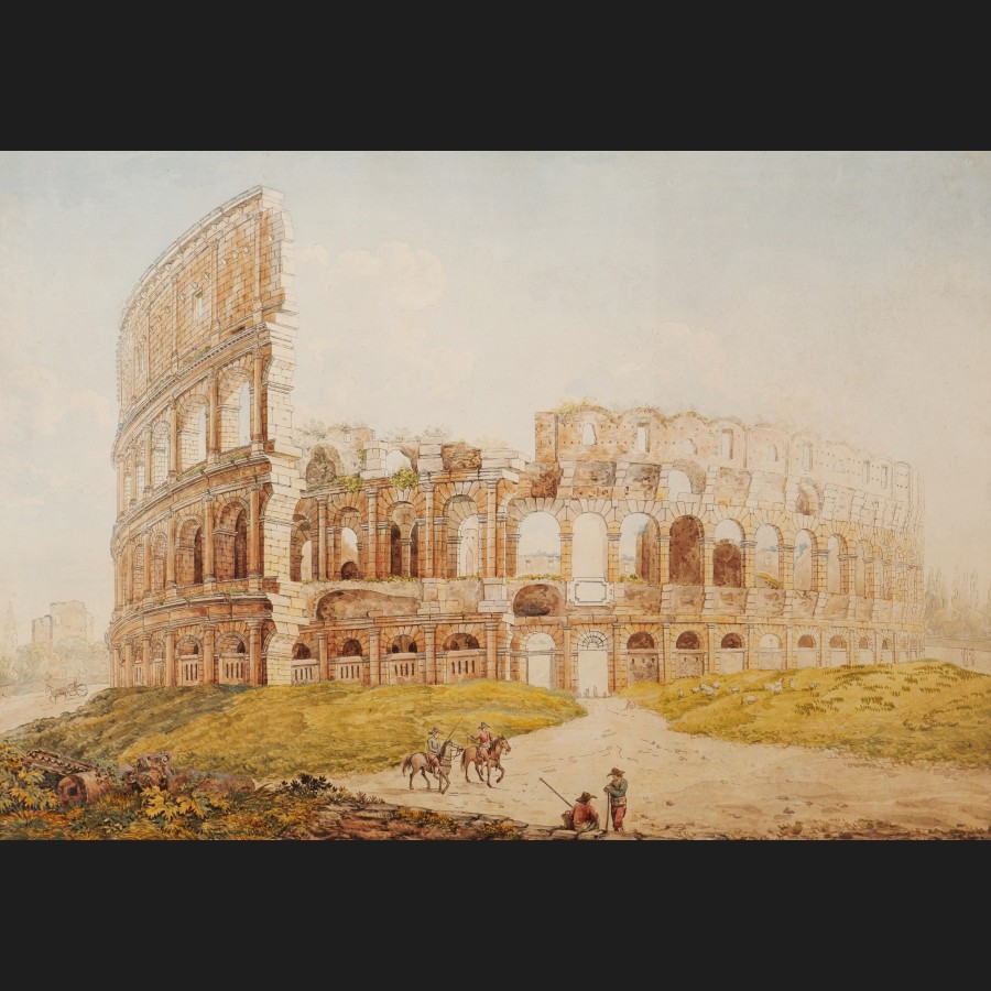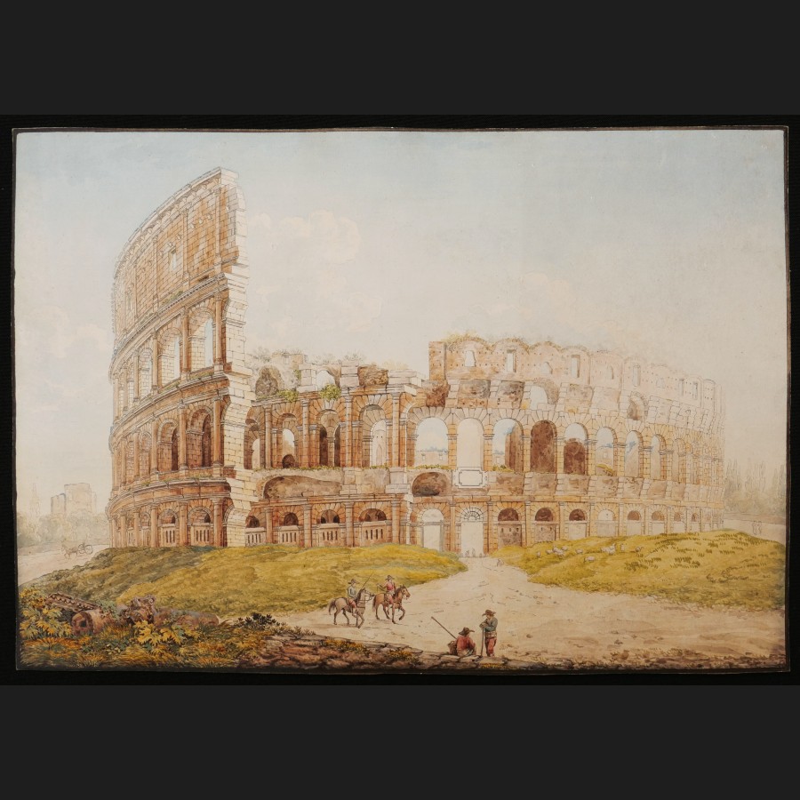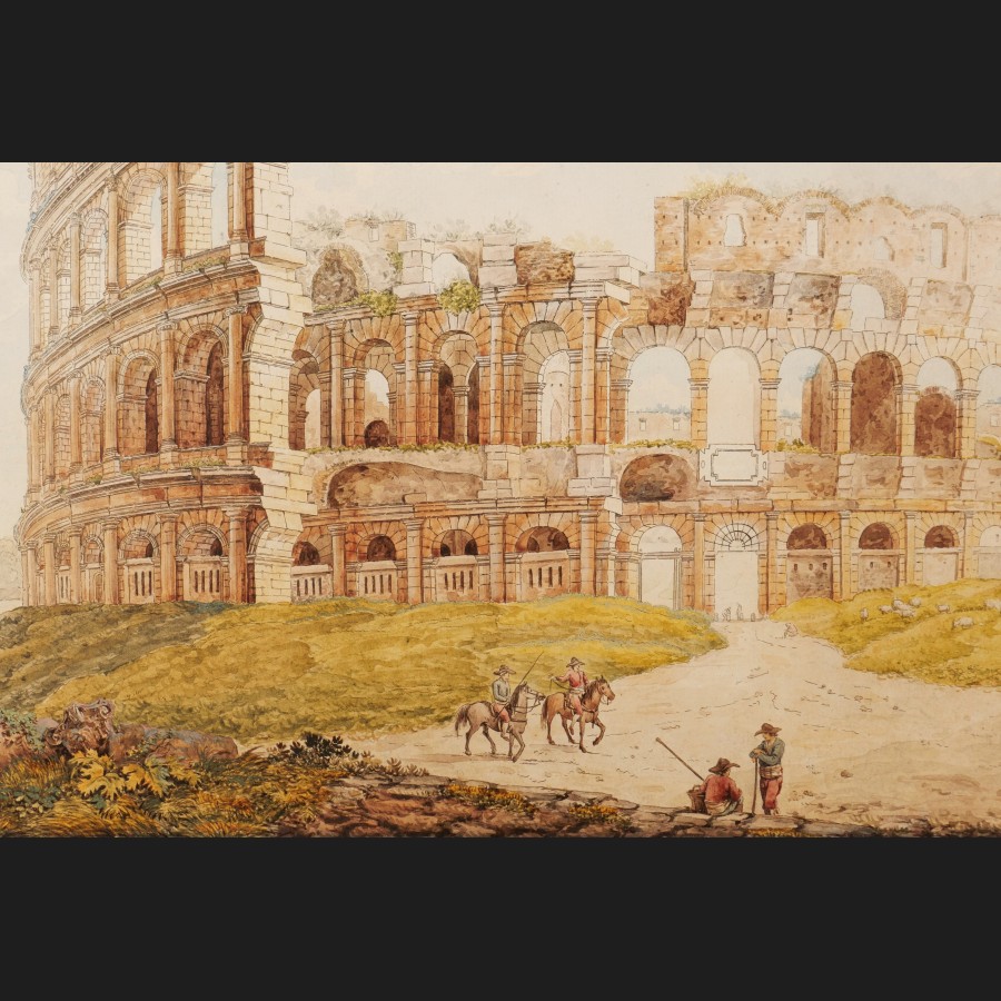 École ITALIENNE du XIXème siècleVue animée devant le ColiséePlume, encre noire, aquarelle et gouache sur papier29,5 x 42 cm