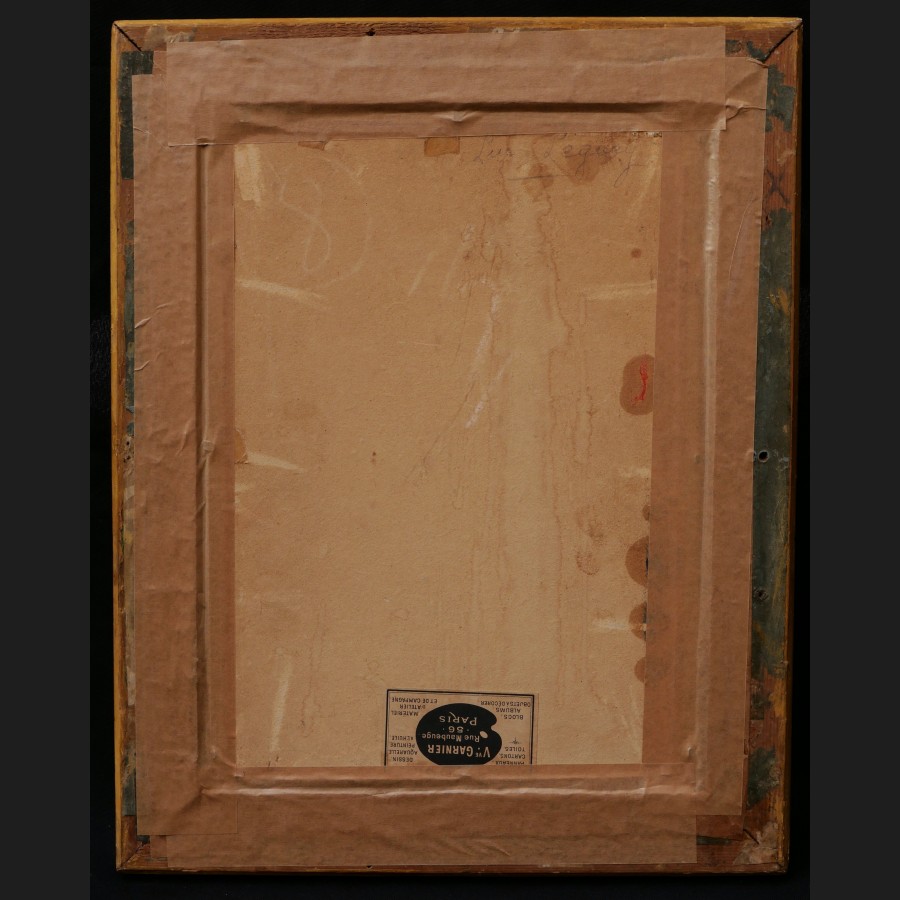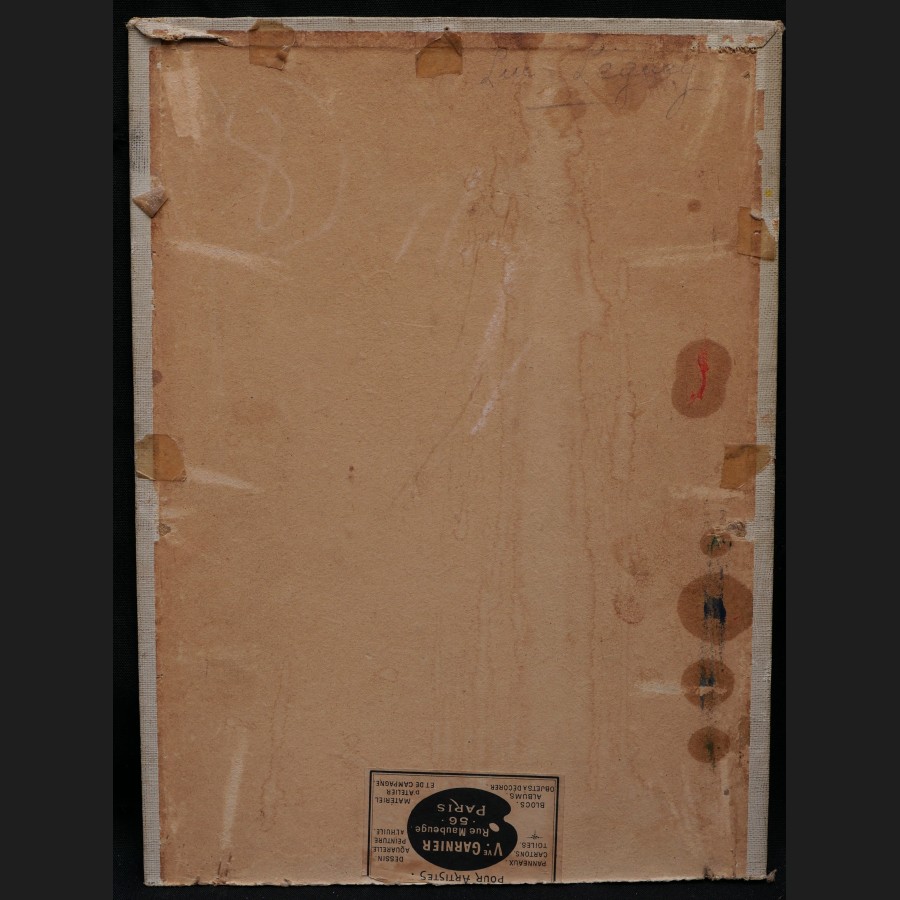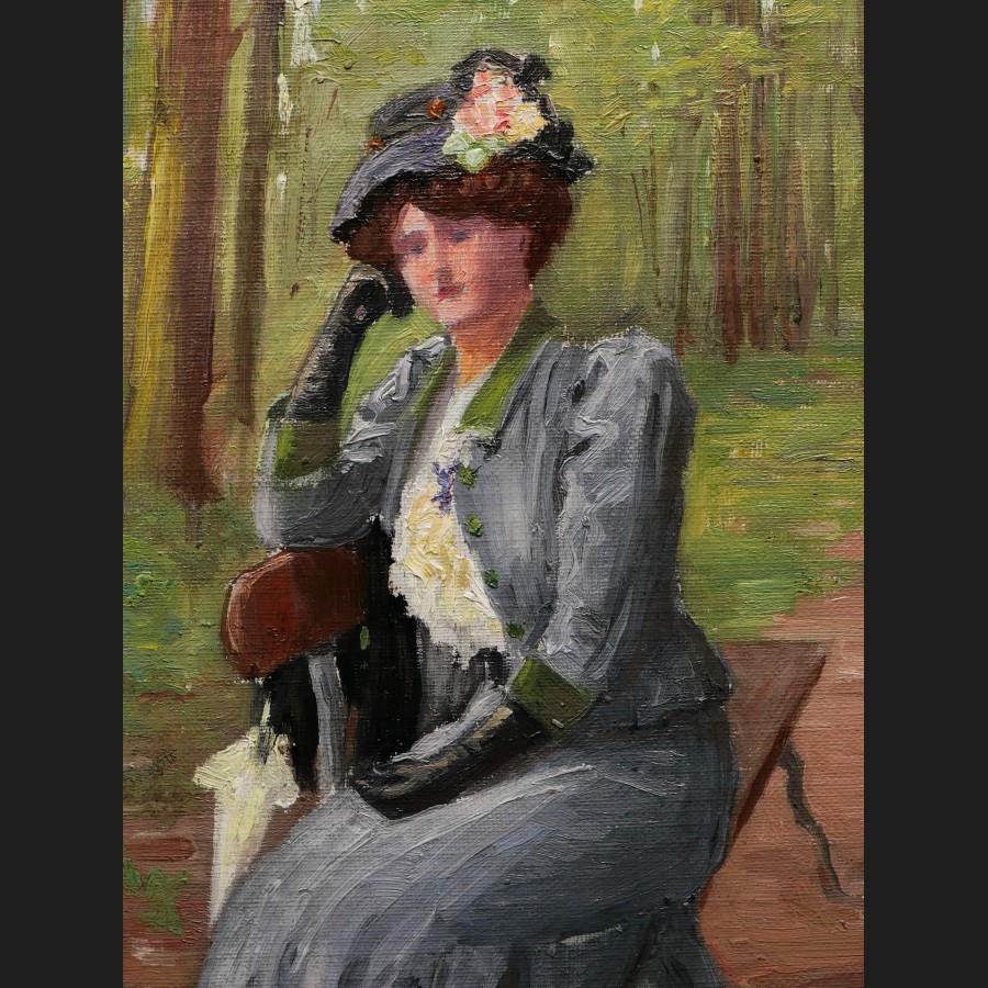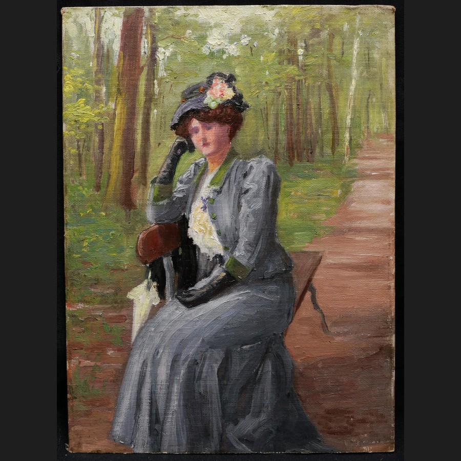 Luc LEGUEY (Paris, 1876 -?)Femme assise sur un bancHuile sur carton toiléSigné au revers Luc Leguey32,8 x 24,2 cm