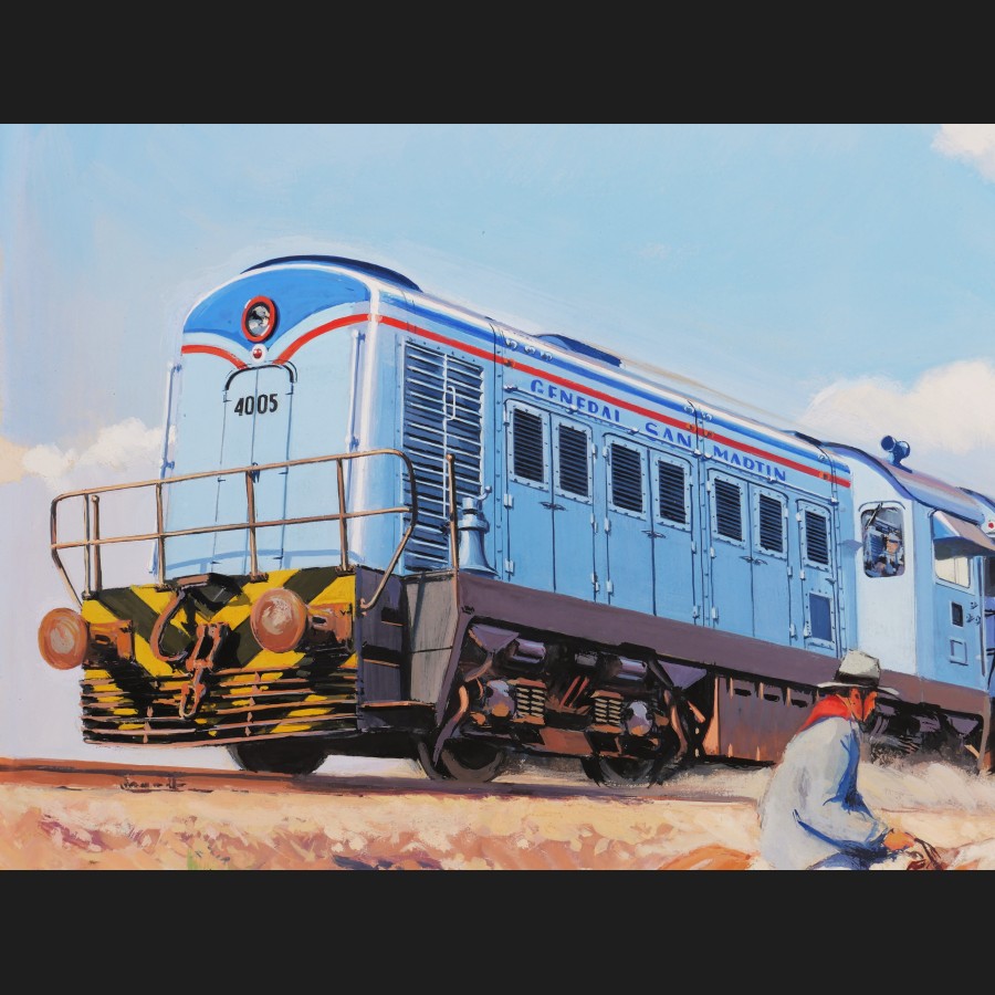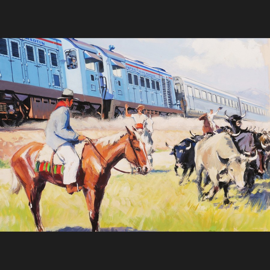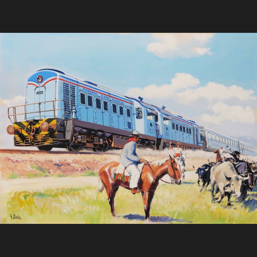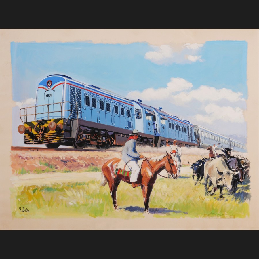 Yves DELFO, Le train de la General San Martín et deux gauchos dans la campagne en Argentine, gouache