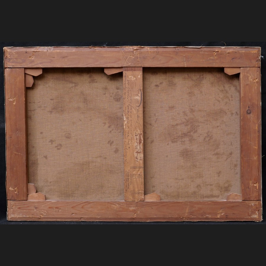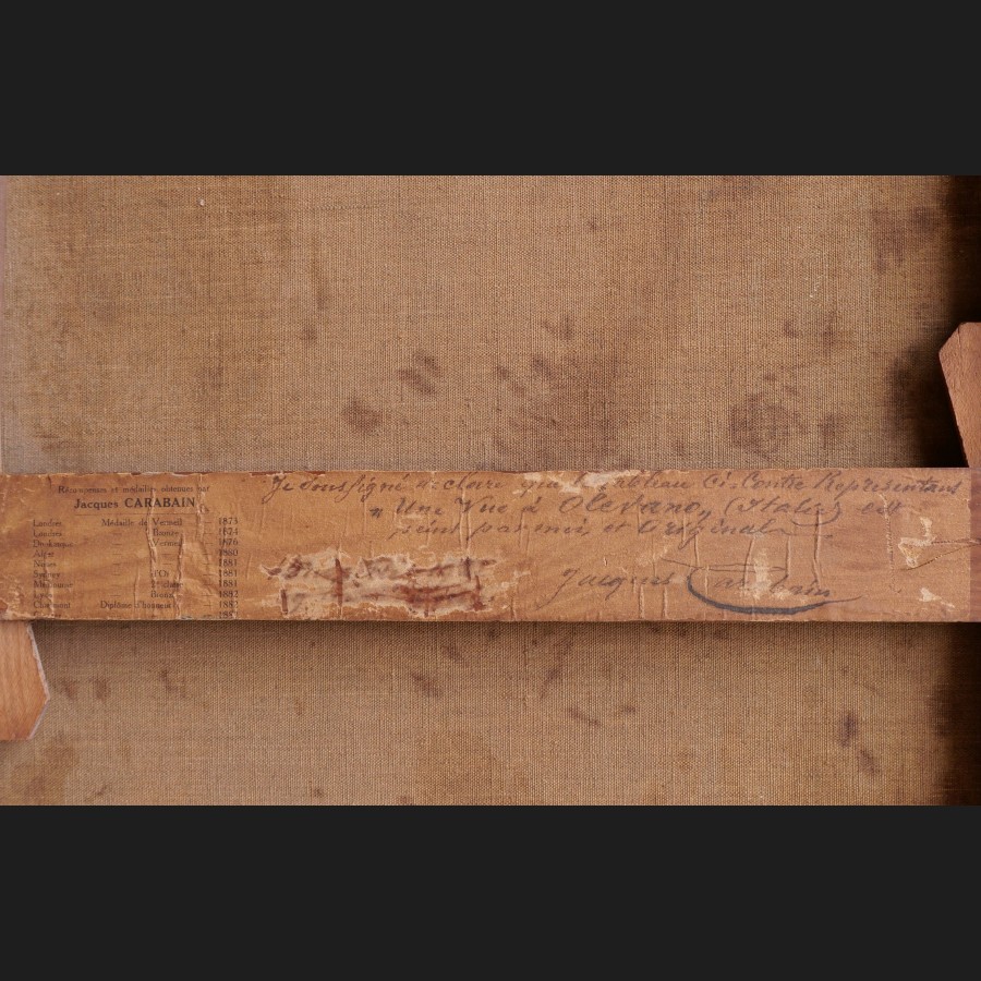 Étiquette au dos inscrite et contresignée Je soussigné déclare que le tableau ci-contre représentant « Une vue à Olevano » (Italie) est peint par moi et original / Jacques Carabain