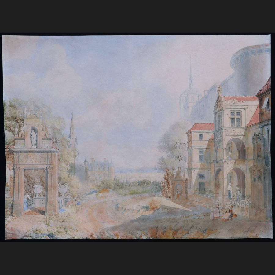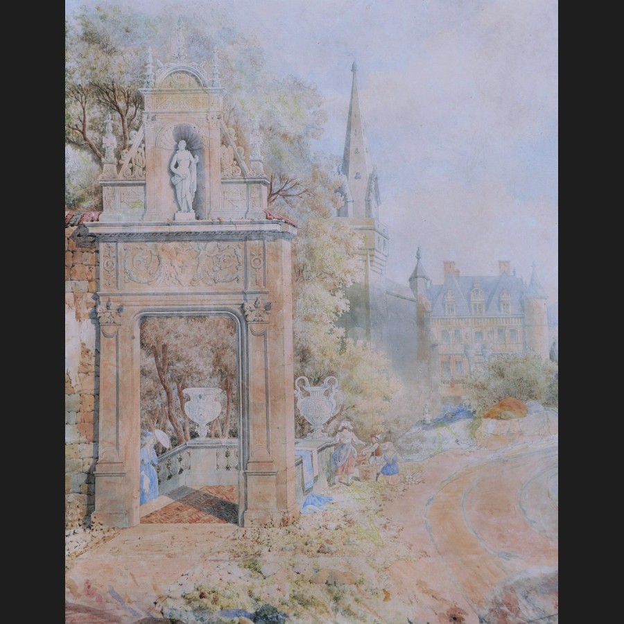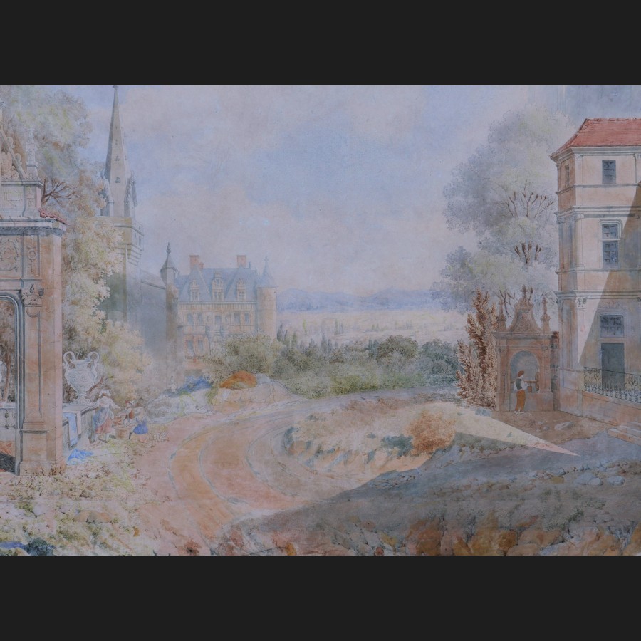 Attribué à Jean Lubin VAUZELLE, Personnages dans un décor romantique de monuments imaginaires, aquarelle