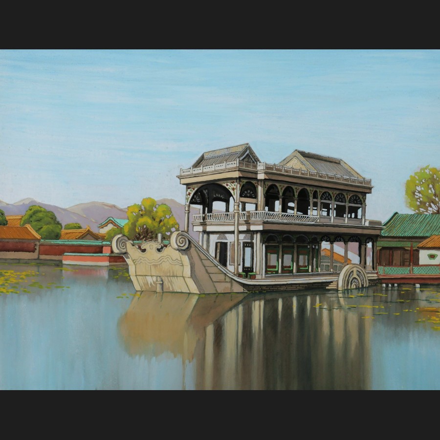 Neuf vues de temple ou de palais en Chine, dont une vue du bateau de marbre du Palais d'Été de Beijing