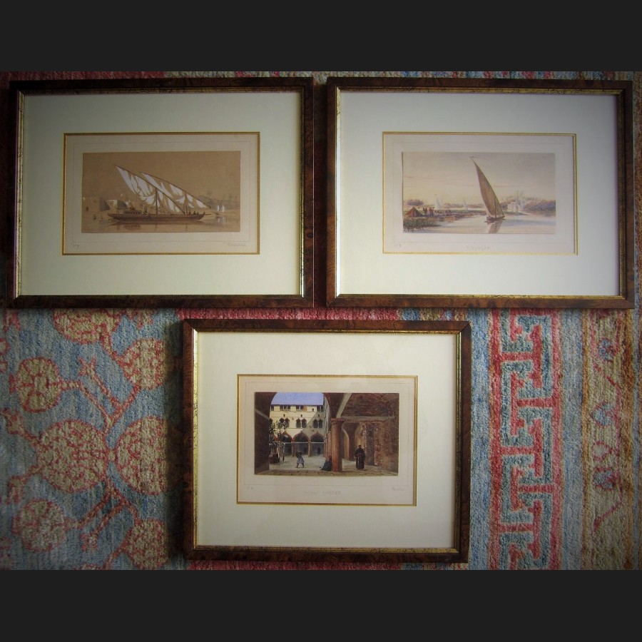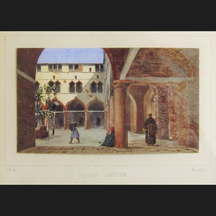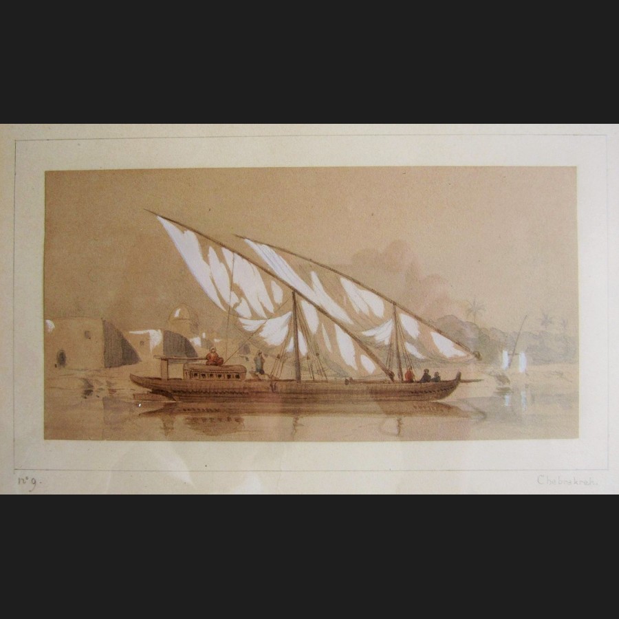 Trois vues d'Egypte : Couvent chrétien à Rosette (n°6), Félouques et dromadaires à Mischleh et Félouque à Chebrakreh (n°9)