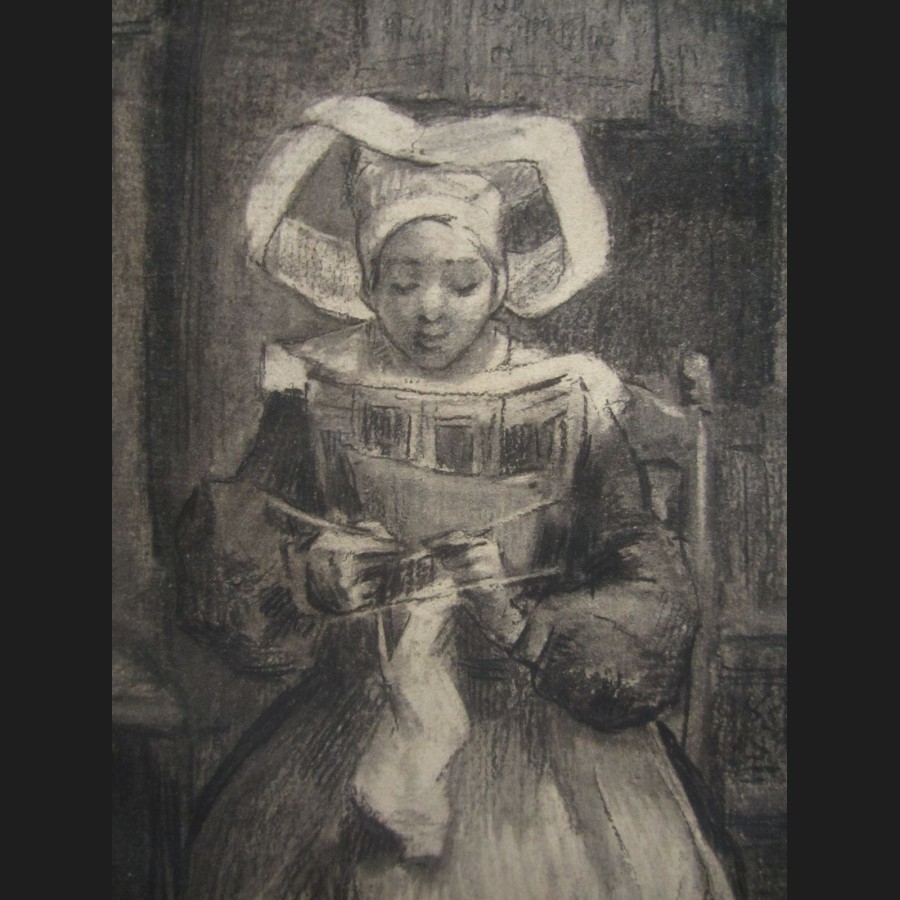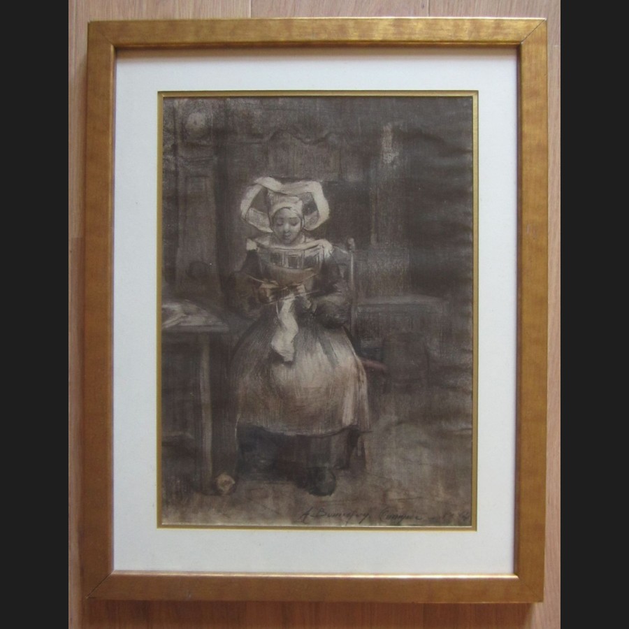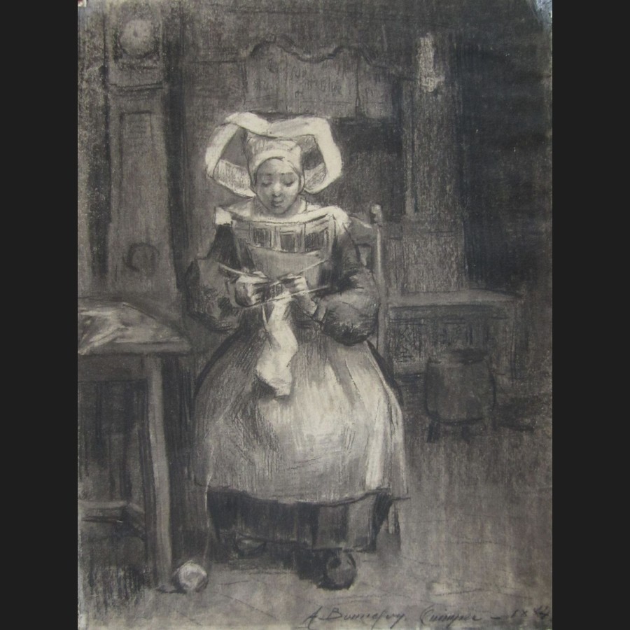 Adrien BONNEFOY, Bretonne de Quimper tricotant dans un intérieur, dessin