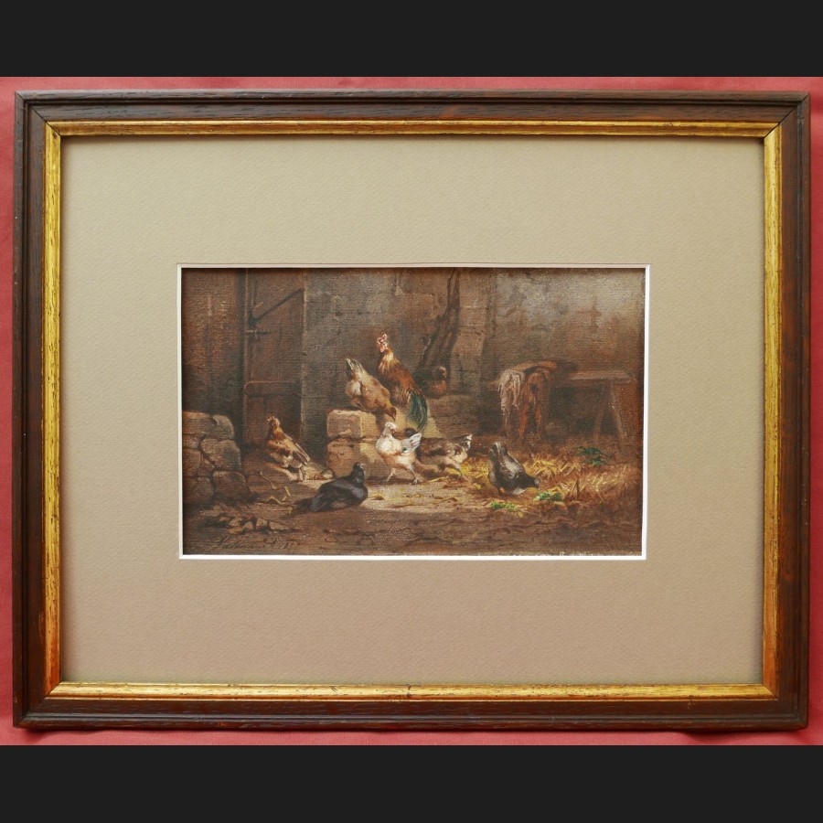 École FRANÇAISE circa 1850, Coq et poules dans un poulailler, gouache