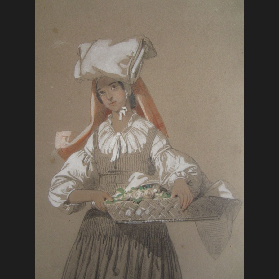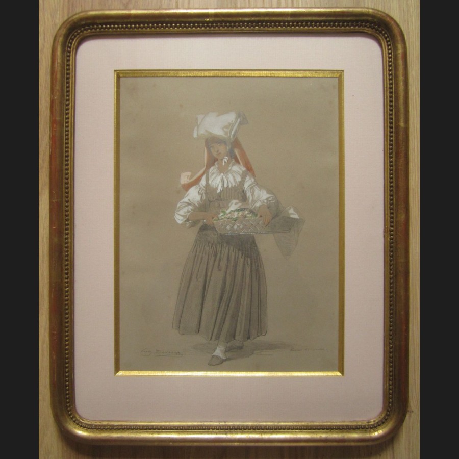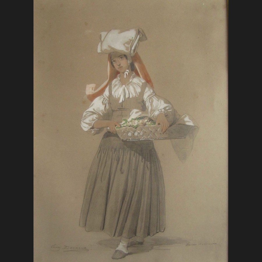 Eugène François Marie Joseph DEVÉRIA, Paysanne de la vallée d'Ossau tenant une corbeille de fleurs, dessin