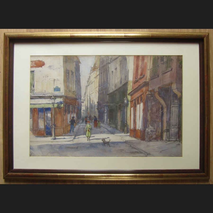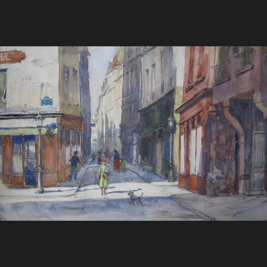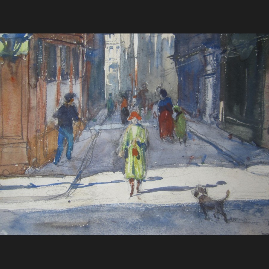 École FRANÇAISE circa 1920, Paris, la rue Quincampoix animée, aquarelle