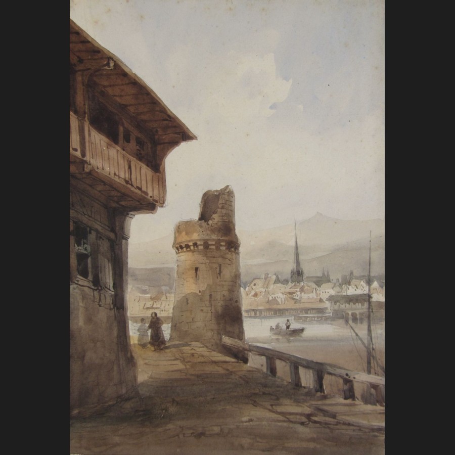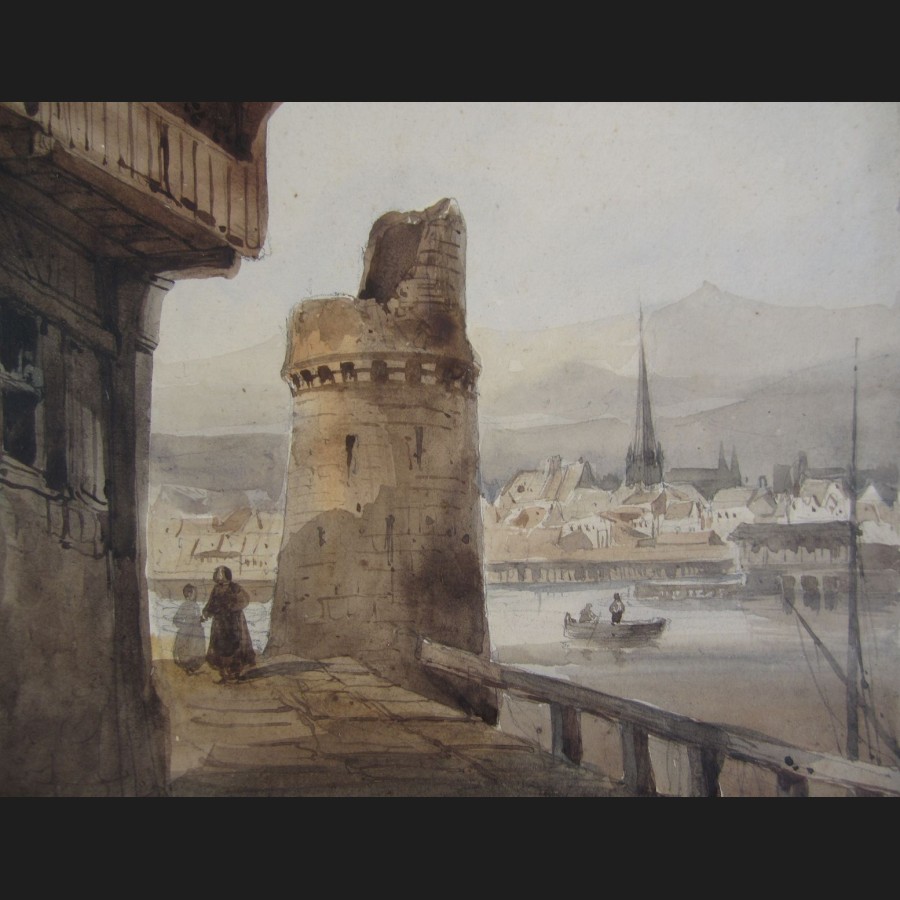 Eugène ISABEY, Vue d'une ville sur un lac, aquarelle