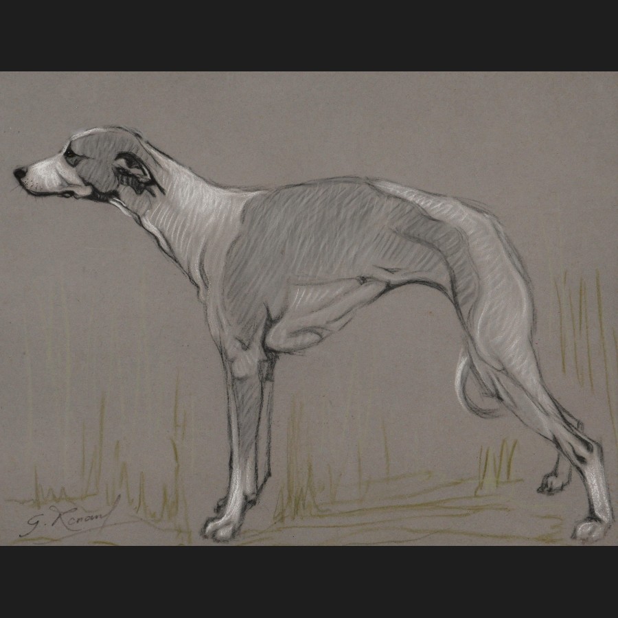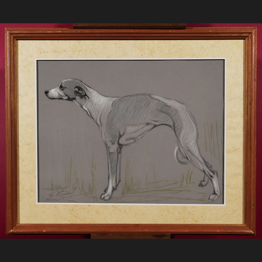 École FRANÇAISE circa 1930Lévrier hongroisFusain, craie blanche et pastel sur papier grisSigné en bas à gauche G. Renaud50 x 65 cm Cadre en bois