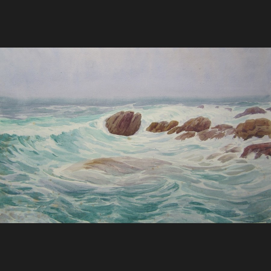 Paul LEMOINE, Rochers dans la houle, temps couvert, Bretagne, aquarelle n°25