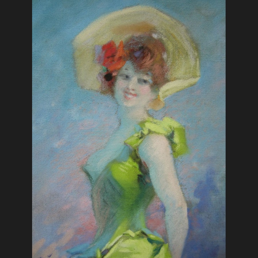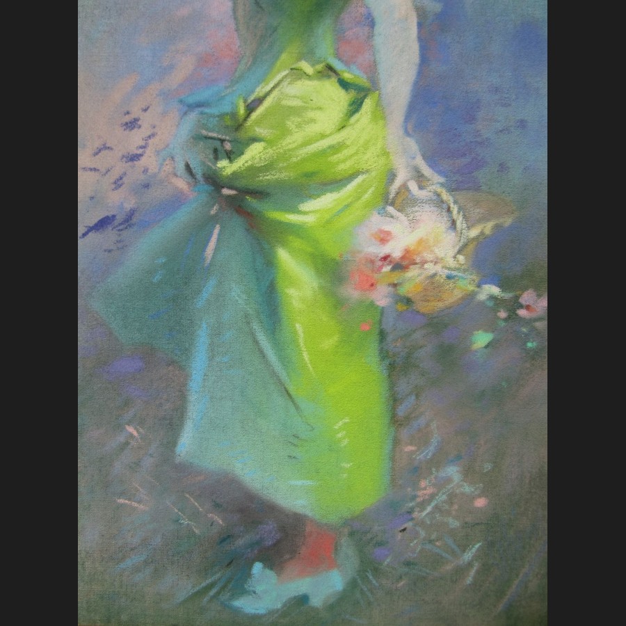 Jules CHÉRET (Paris, 1836 – Nice, 1932)Femme en robe verte tenant un panier de rosesPastel sur toileSigné en bas à droite J Chéret42 x 22 cm